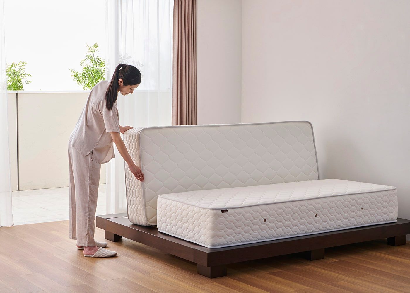 ここからはa.flatのベッドフレームに、プラチナ・ダブルスプリング・マットレスを配置した際の高さイメージをご紹介。(写真は、