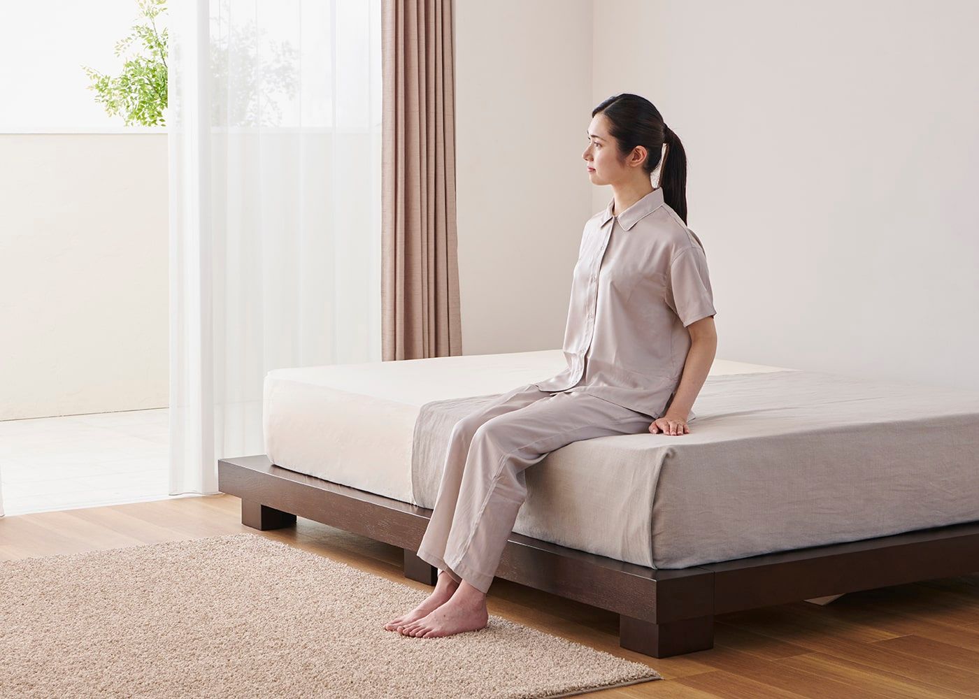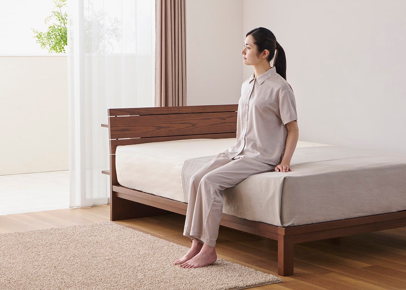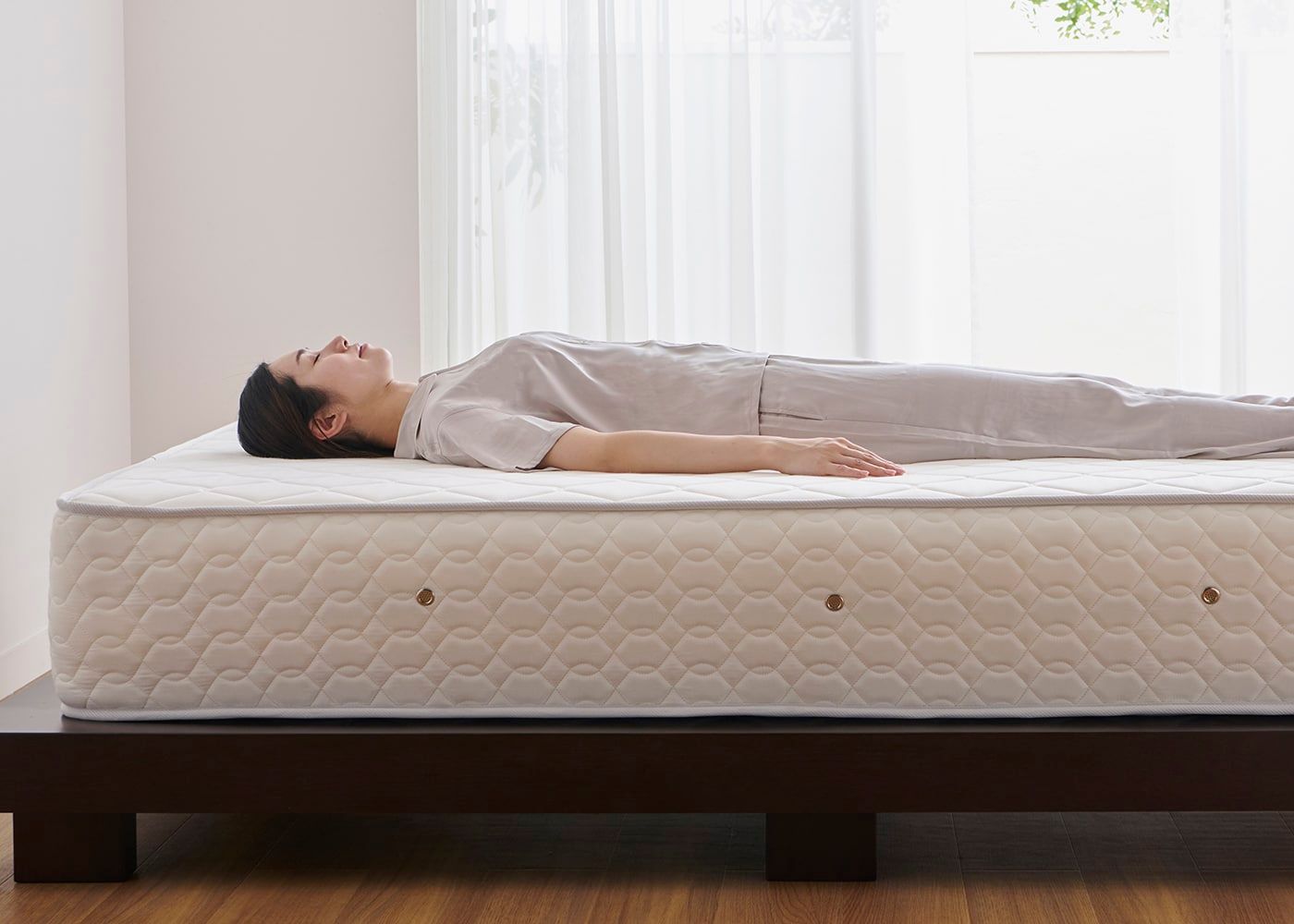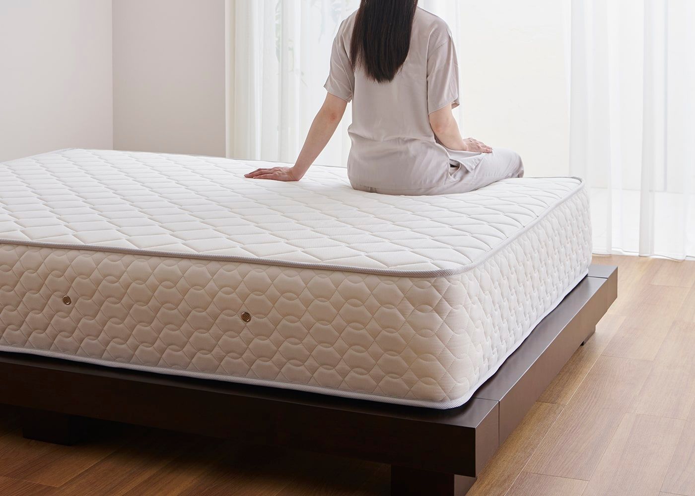 コト・ローベッドv01にダブル(ハード)を置いたイメージ。(マットレス上面高さ=330mm。モデルは身長167cmの女性)