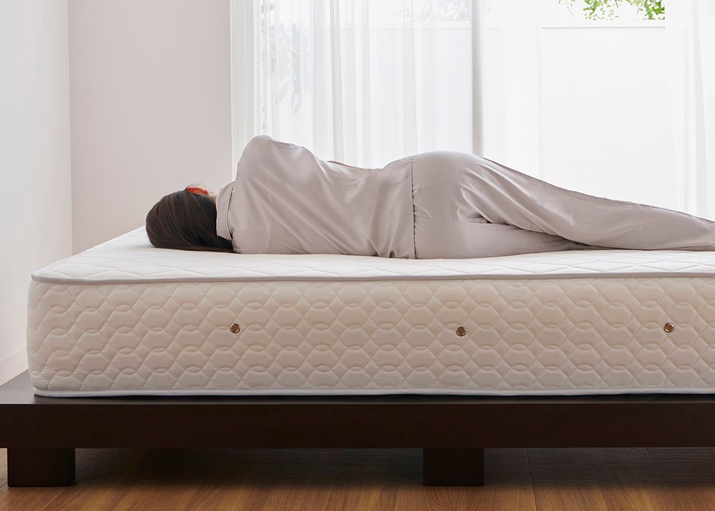 写真のマットレス硬さはハード。モデルは伸長167cm、体重49kgの女性。横向きの状態。