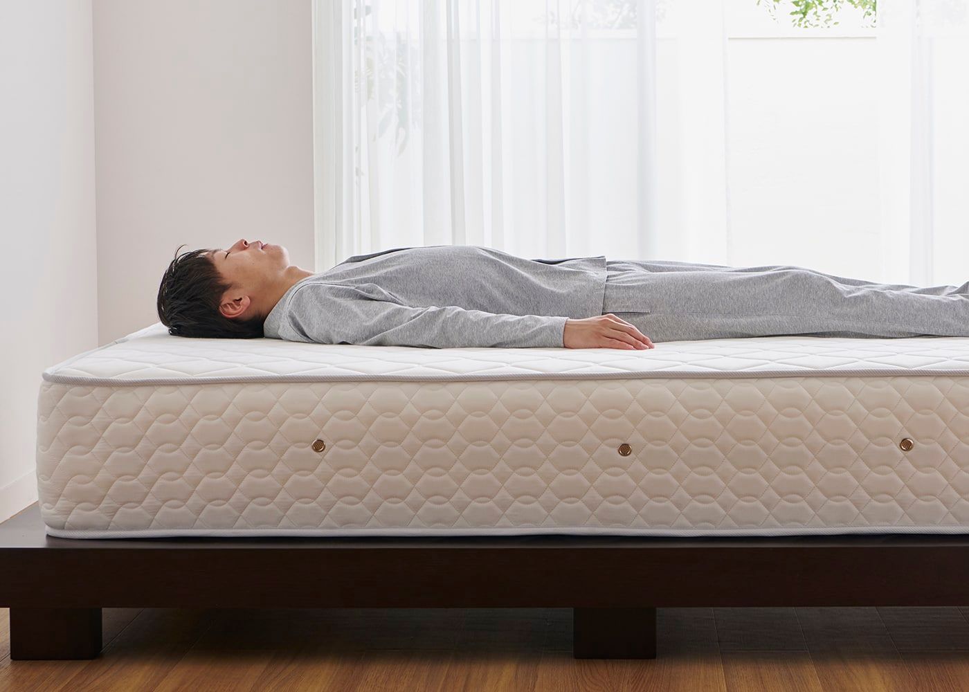 写真のマットレス硬さはハード。モデルは伸長171cm、体重60kgの男性。仰向けの状態。