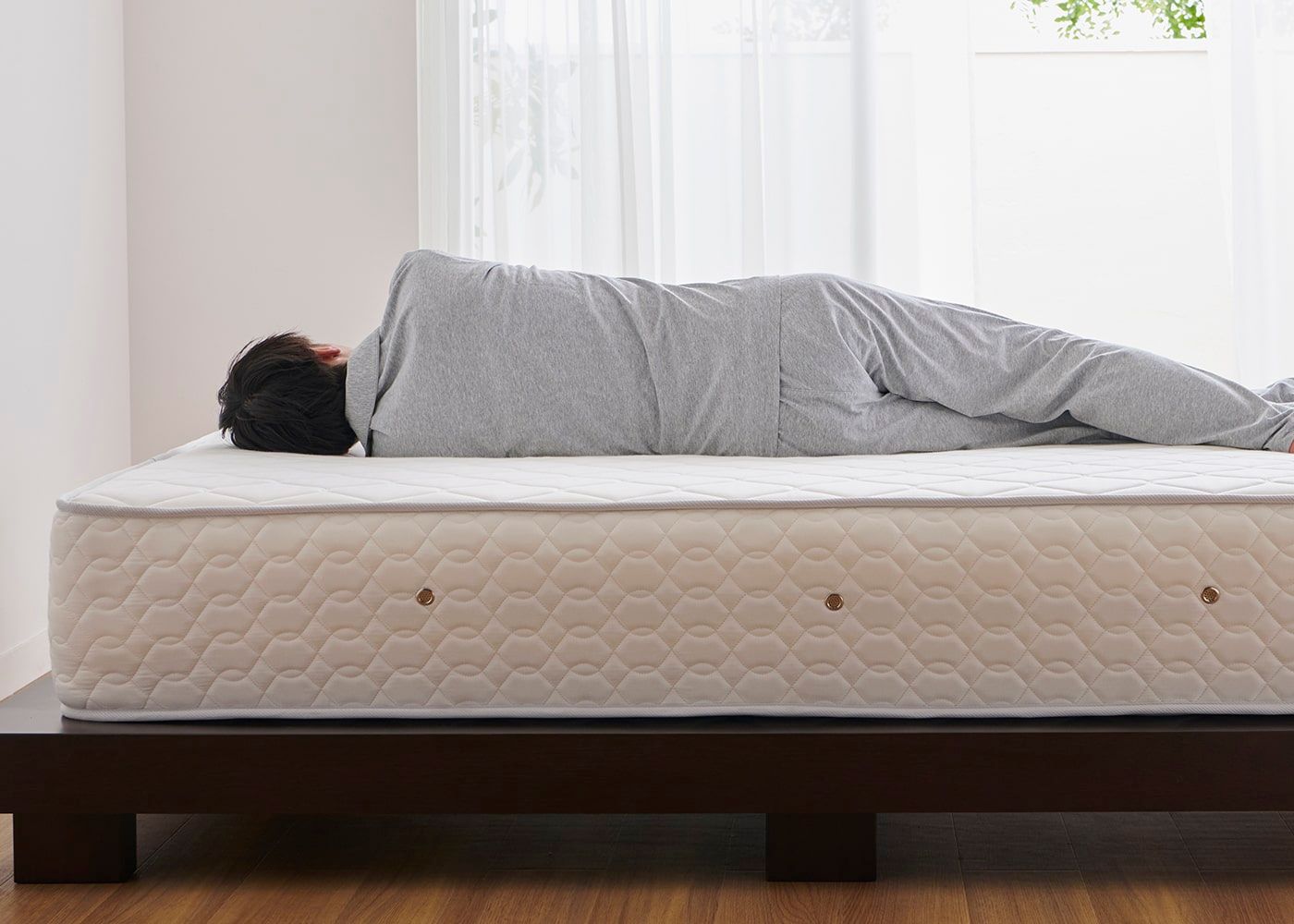 写真のマットレス硬さはハード。モデルは伸長171cm、体重60kgの男性。横向きの状態。