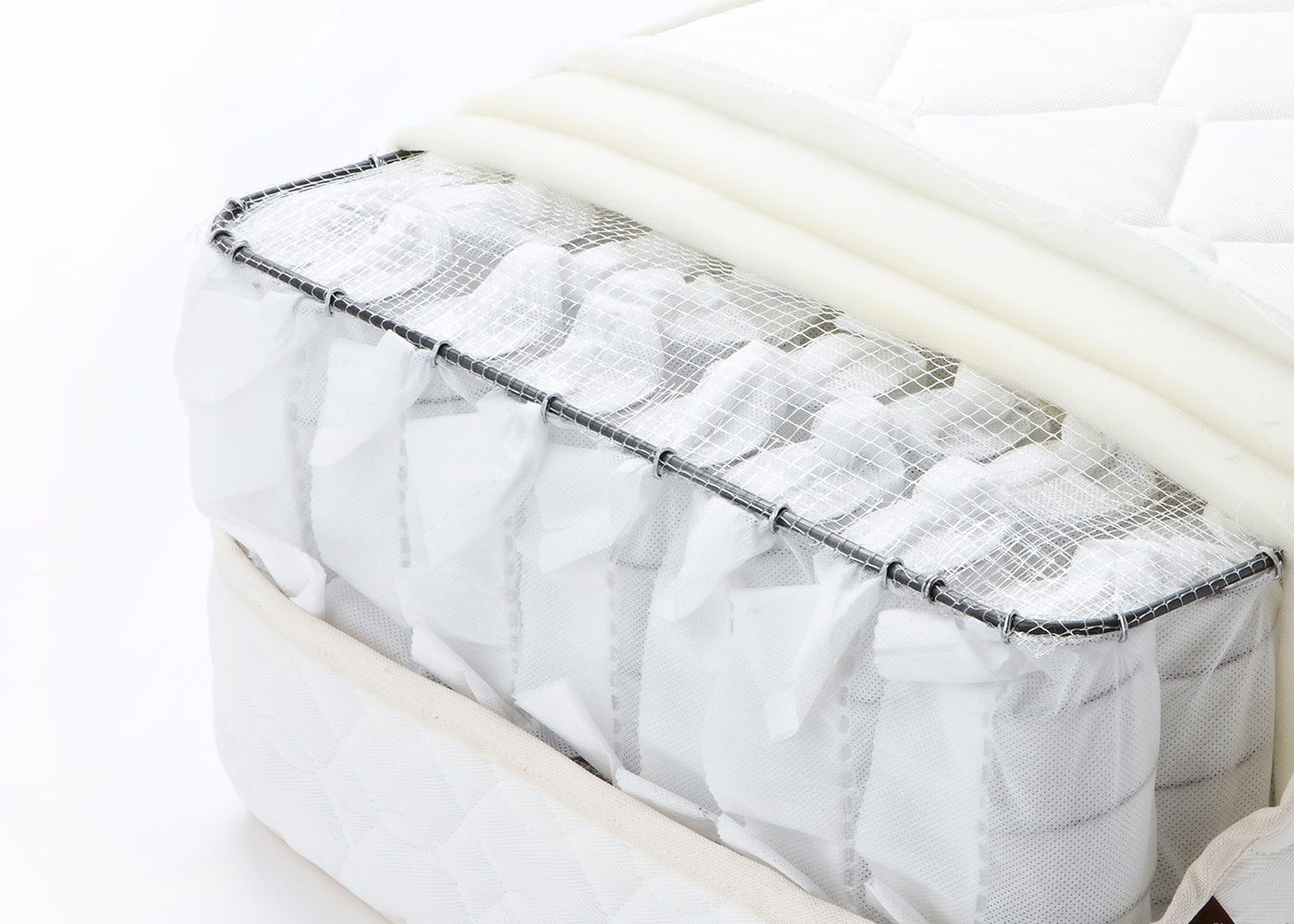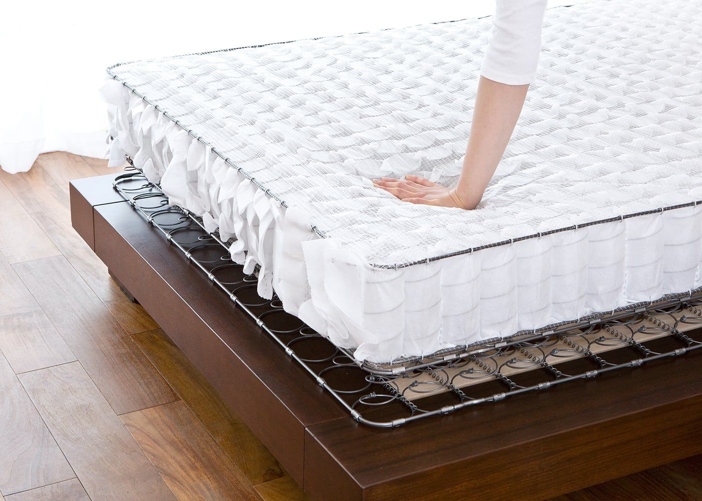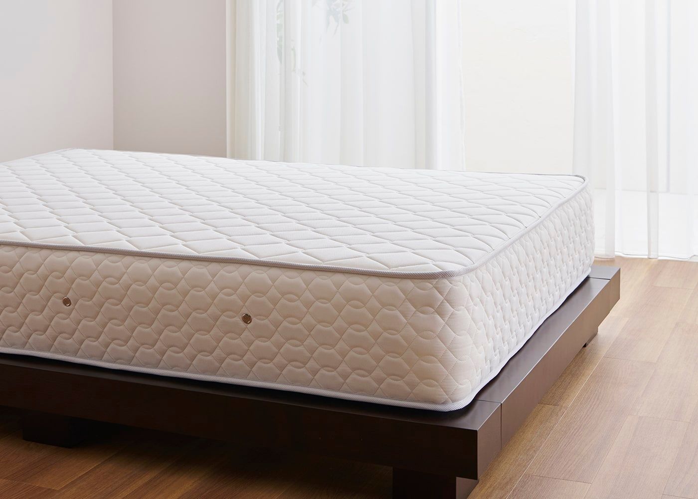 長く使えるマットレスの条件として、表面の詰め物の適度な厚みが挙げられます。ほどよい感触の詰め物が硬すぎず柔らかすぎない寝心地を実現し、また後日に寝心地を調整したい場合にもマットレストッパーなどを使いやすい構造と言えるでしょう。