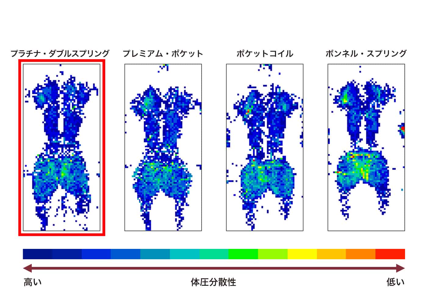 人が寝そべったときの体圧分散の度合いを示しています。赤や黄色の部分が少ないほど、また緑や青の部分が多いほど体圧分散性に優れています。プラチナ・ダブルスプリングの高い体圧分散性が証明されています。