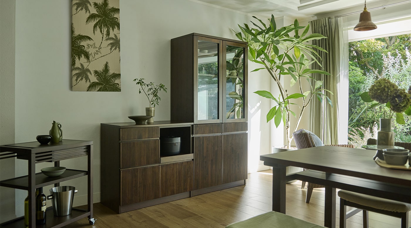 ヴィラのような洗練された空間の中でも雰囲気を損わず、セパレートできるパーテーションです。広いダイニングだからこそポイントとなる間仕切りを置いて、メリハリをつけたコーディネートをお試しください。