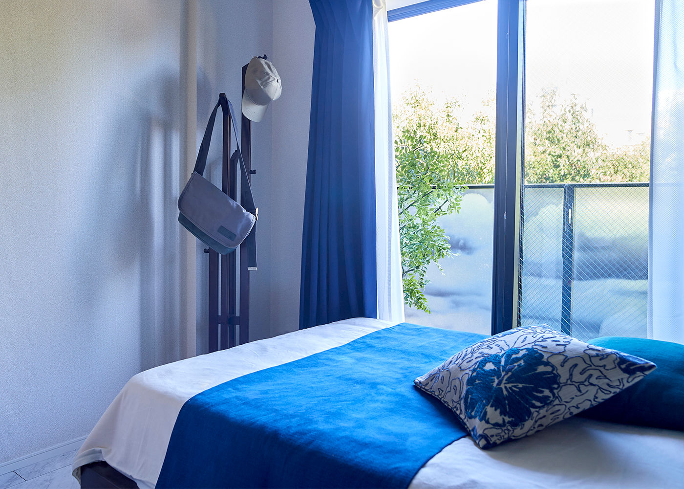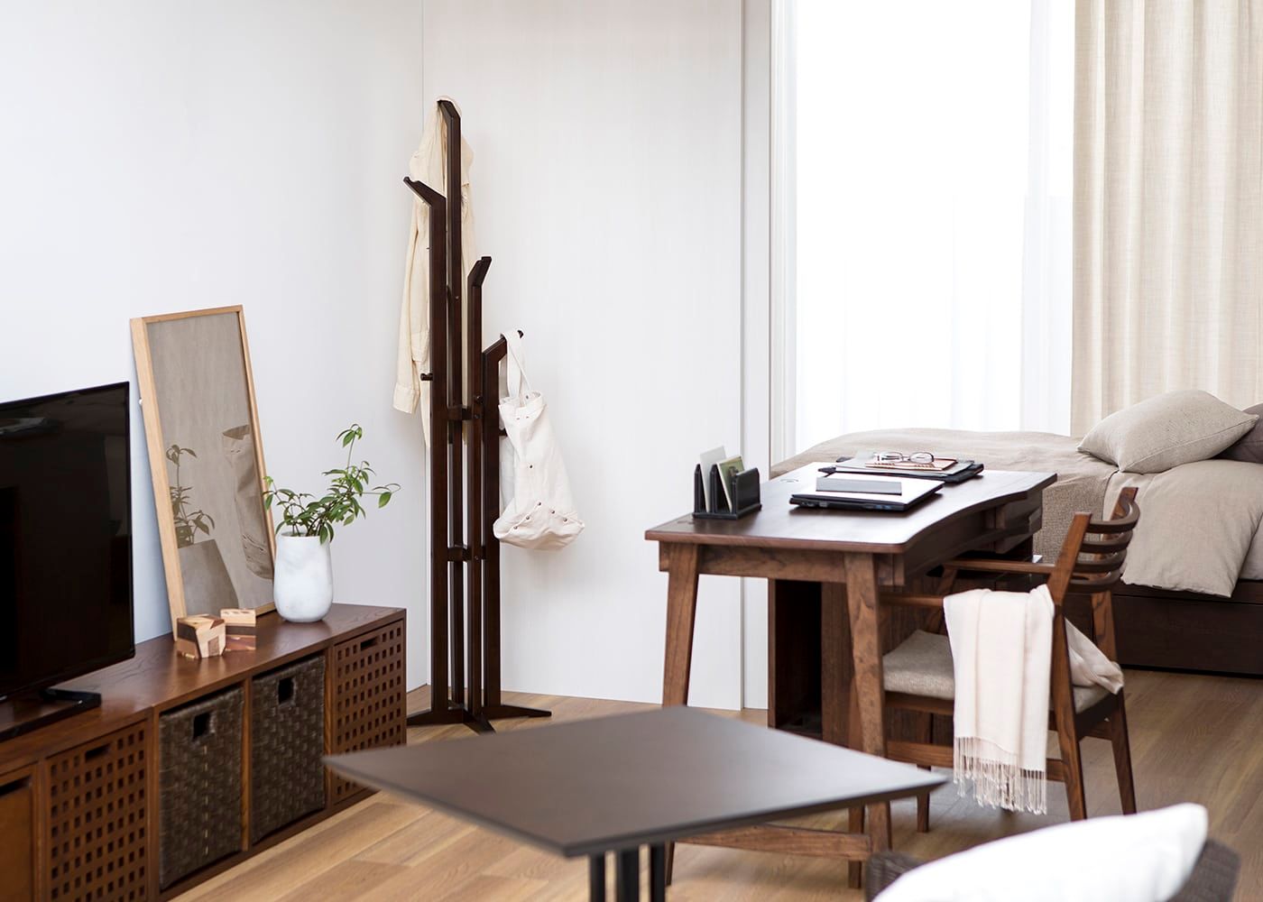 狭い1DKにゆとりを生む「ローベッド」が中心の寝室で、掃き出し窓にかかっても開放感が溢れる空間に。ベッド周りには収納力とインテリア性を兼ね備えたコートハンガーをレイアウトして、ホテルライクな雰囲気で演出しました。
