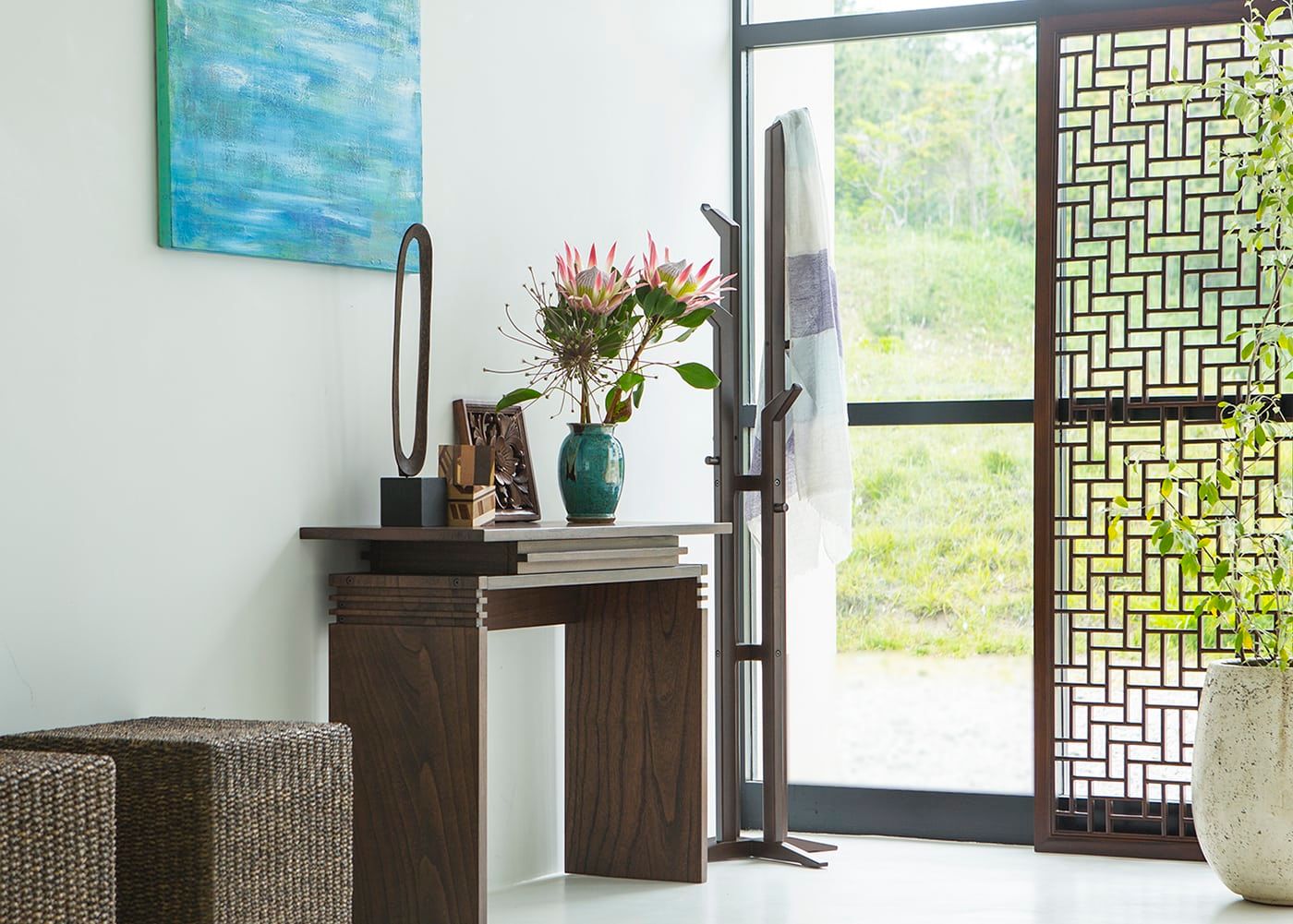 コンソールテーブルと合わせたコーディネート例。家に入ってすぐの場所にコートハンガーを置く時は、お客様が目に入りやすい場所でもあるため、デザイン性があるタイプがおすすめです。アクセントになるコートハンガーはその空間を様変わりさせます。