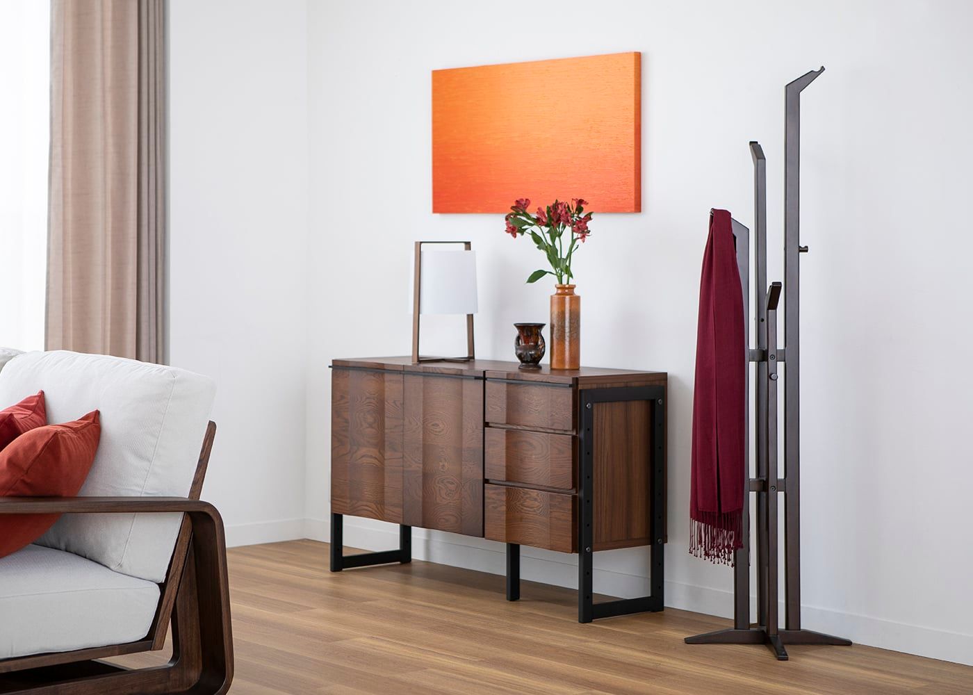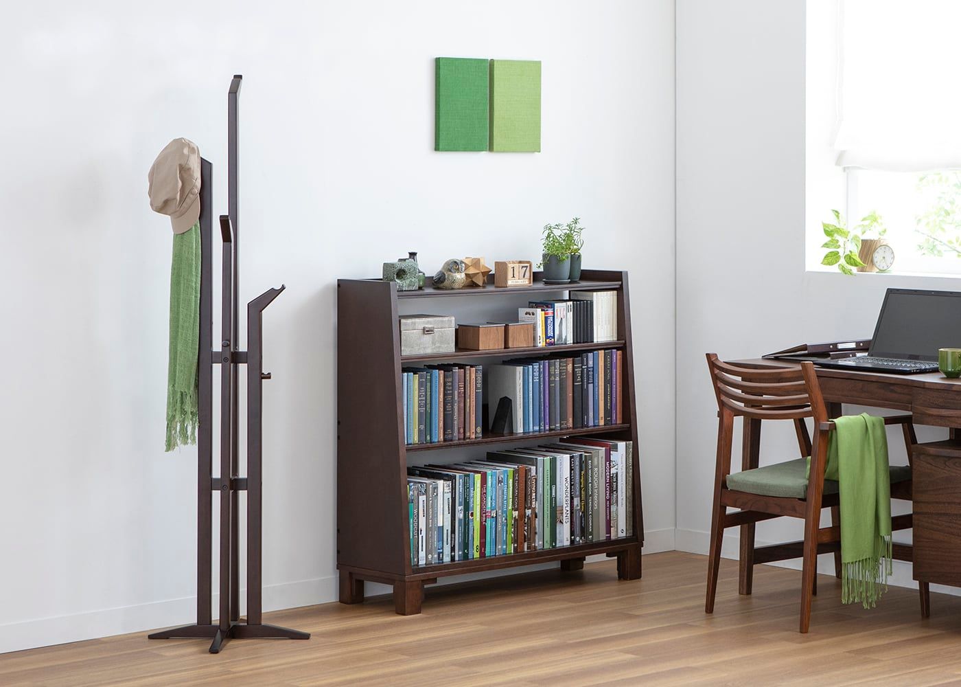 書斎スペースの一角にも置き易いサイズ感が魅力。お部屋の入口側にあると、その場でさっと帽子を手に取ってスムーズに外出できる便利な衣類収納です。