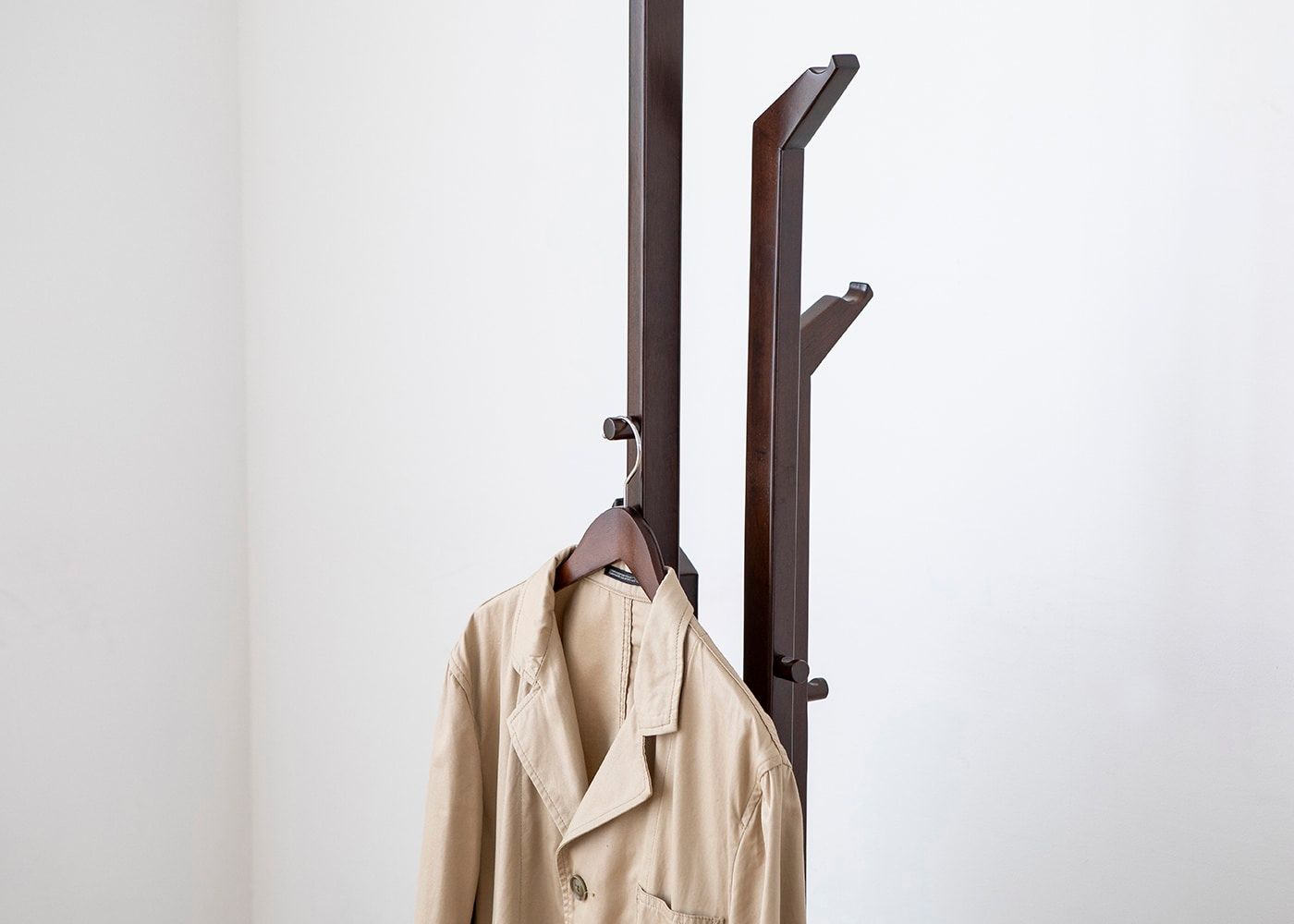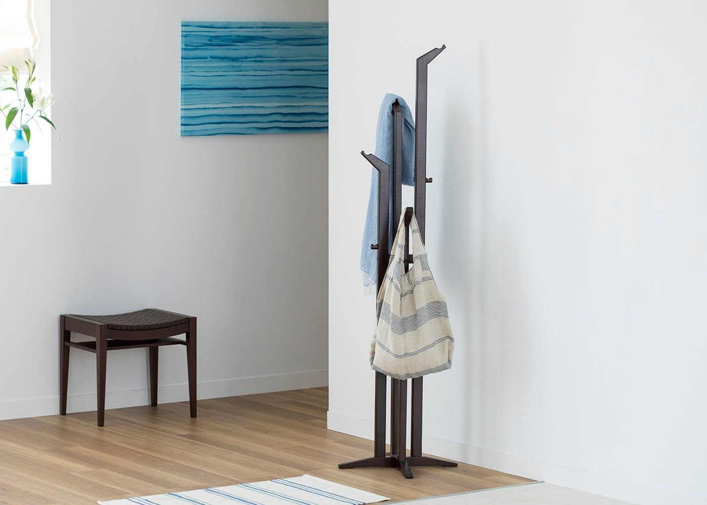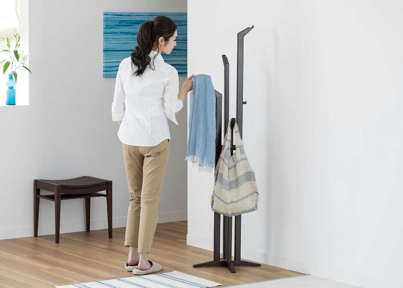 細長いコンパクトサイズなので、玄関先などの限られたスペースにもレイアウト可能。毎日外出する時に必要なバッグやストールなどを一時的に掛けておけます。