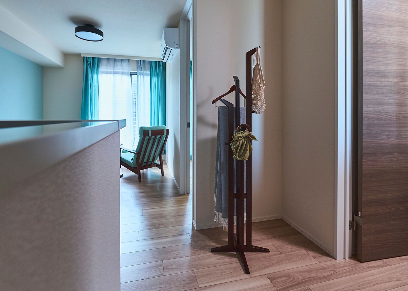「星野リゾートのような空間を自宅で再現したい」というお客様のメゾネット実例。2階に上がったLDKの入口にオブジェのようなコートハンガーを置いて、インテリア性と機能性のある空間を作り上げました。