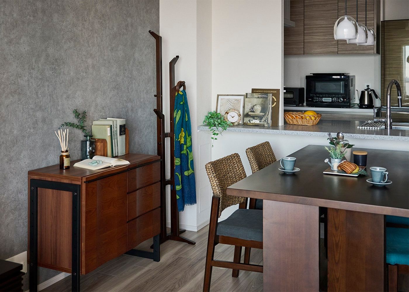 落ち着きのあるカラーバランスでまとめた、二人暮らしのマンション実例。心地良い家具の素材やデザインにこだわり、視覚的にもリラックスできる空間を叶えました。ダイニングには木々を感じさせるコートハンガーを配置して、アクセントをプラスしました。