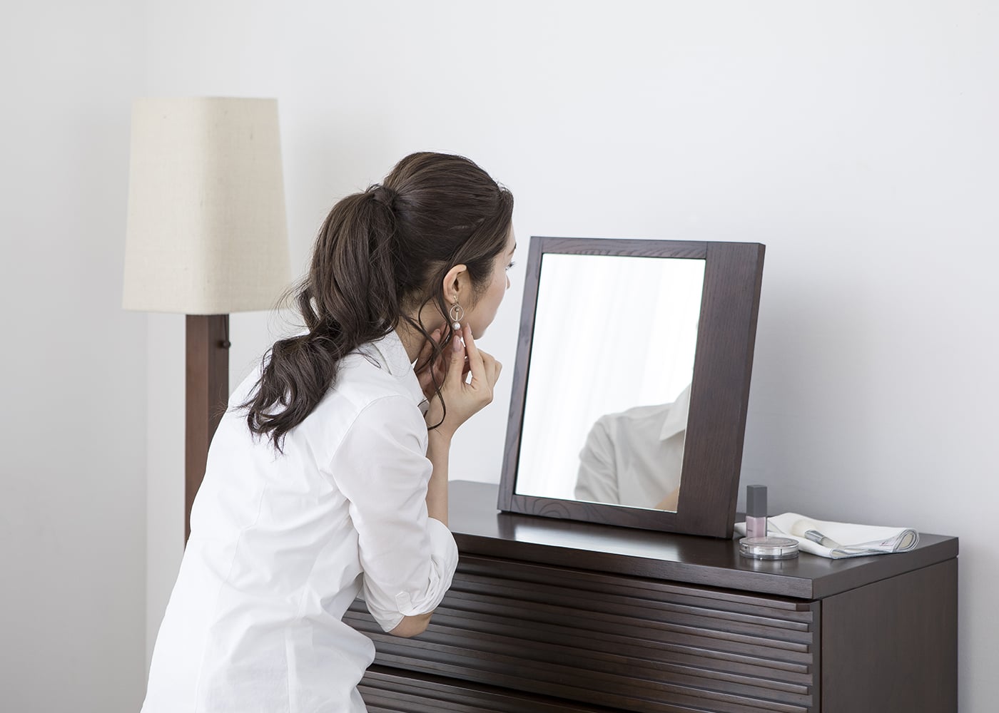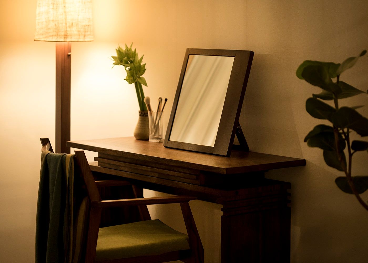 ウッド・ミラー Sv02中心のドレッサー周りに自然感のあるフロアランプを置けば、温もりある灯りに包まれながら寝る前の時間を楽しめます。(写真は
