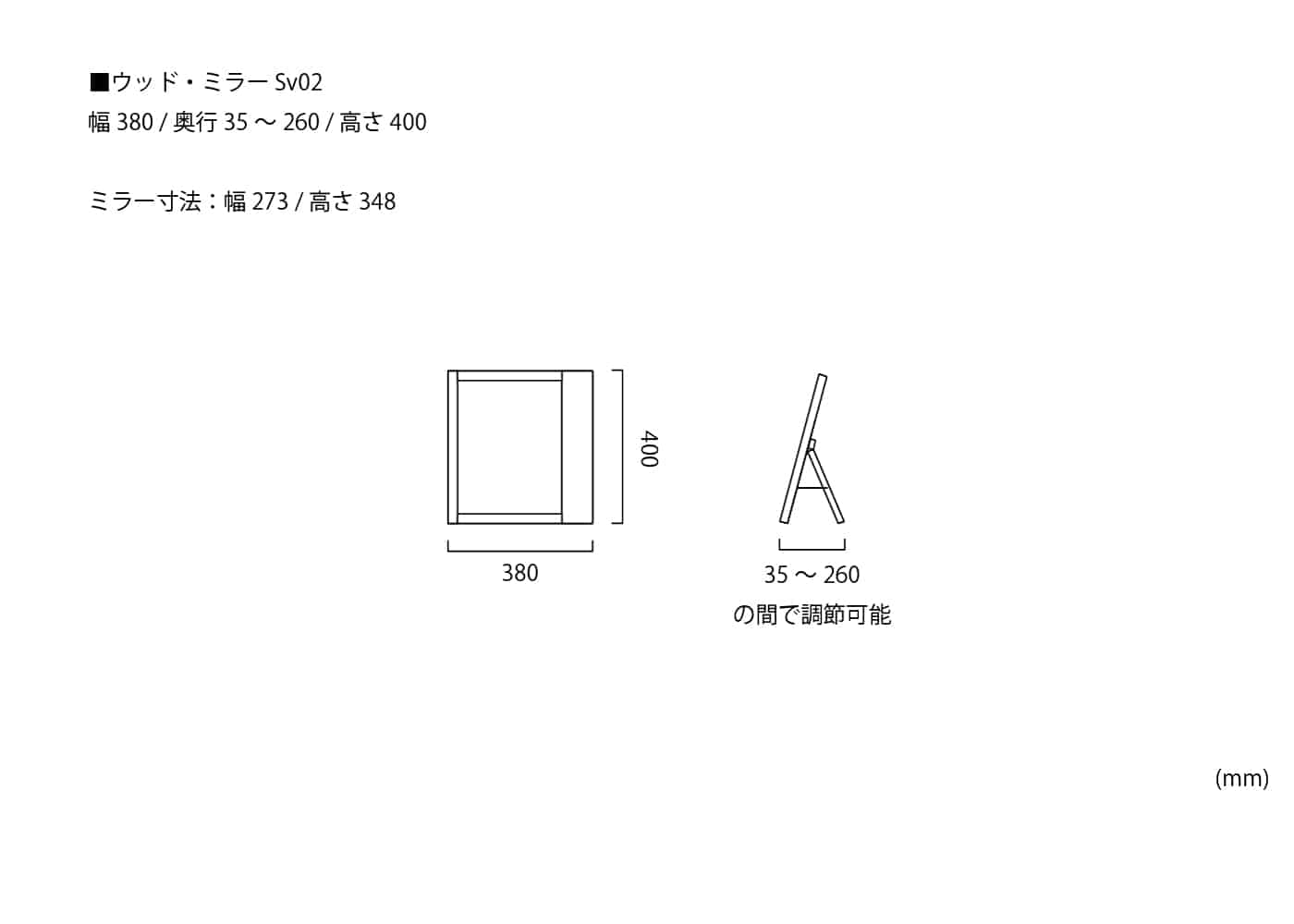 幅 380 / 奥行 35~260 / 高さ 400 ※単位はmm