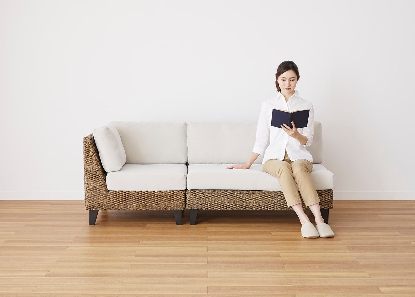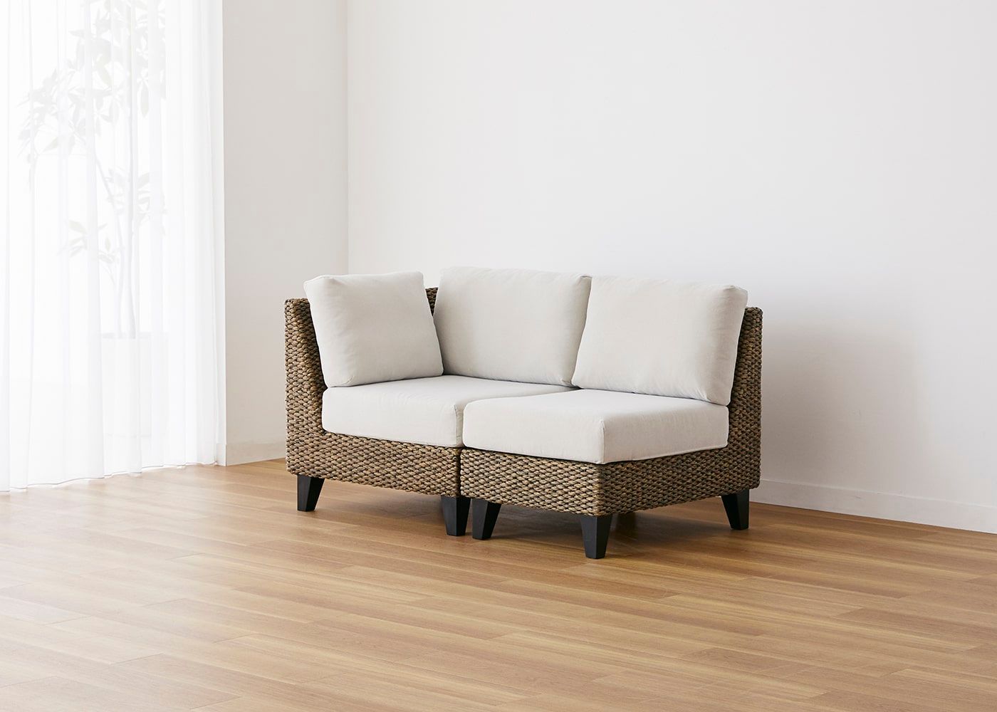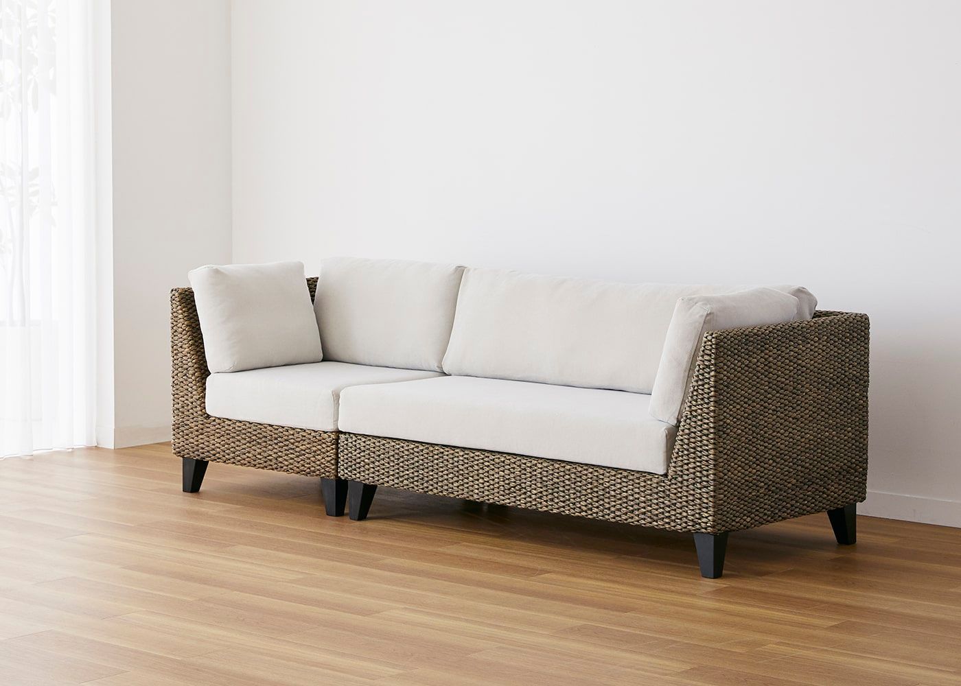コーナーがあるセットのため、将来的にL字のコーナーソファに拡張したい方におすすめです。省スペースでも置けるコンパクトサイズとヒヤシンスの素材感が魅力の、アジアの風を感じさせるソファです。
