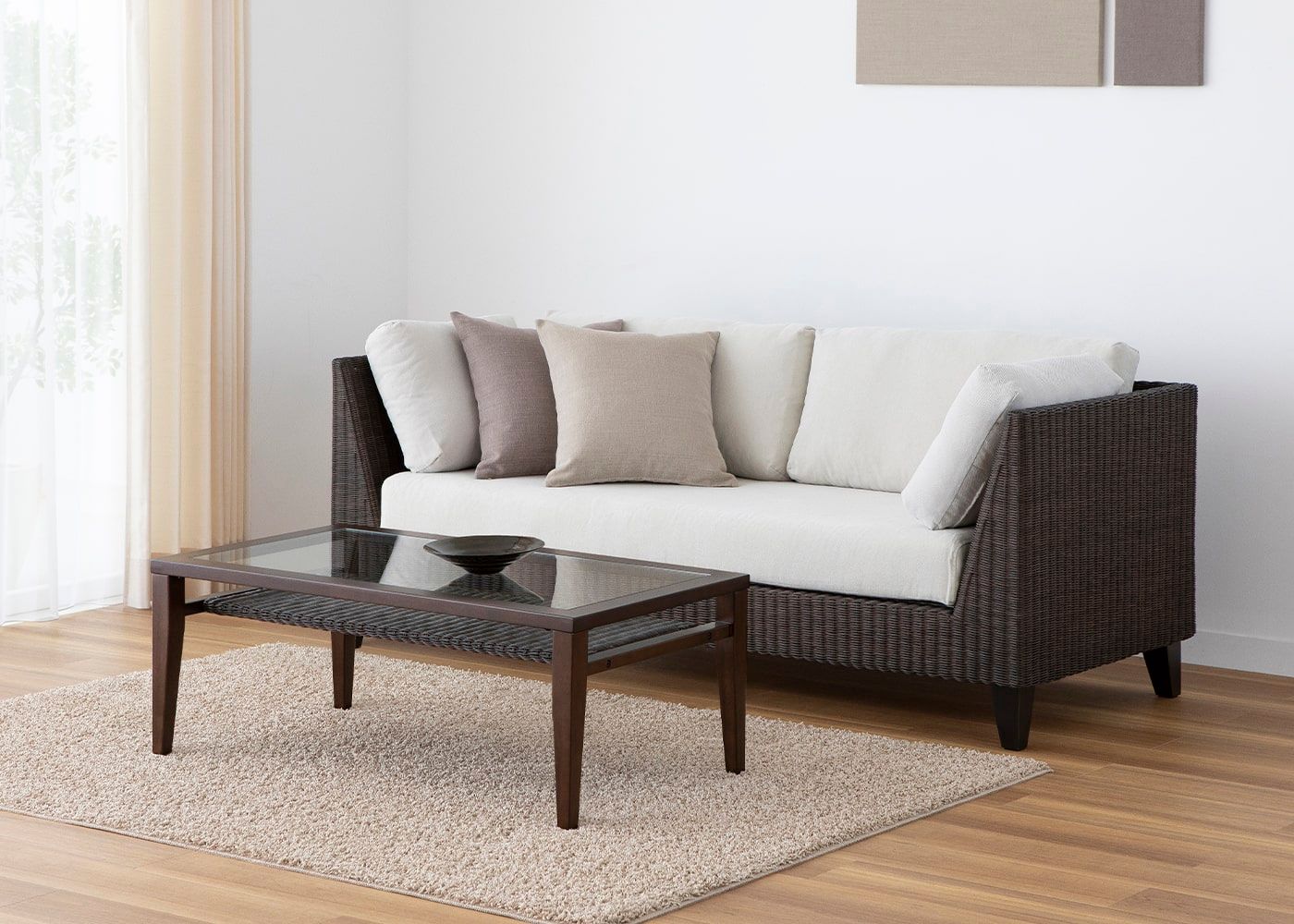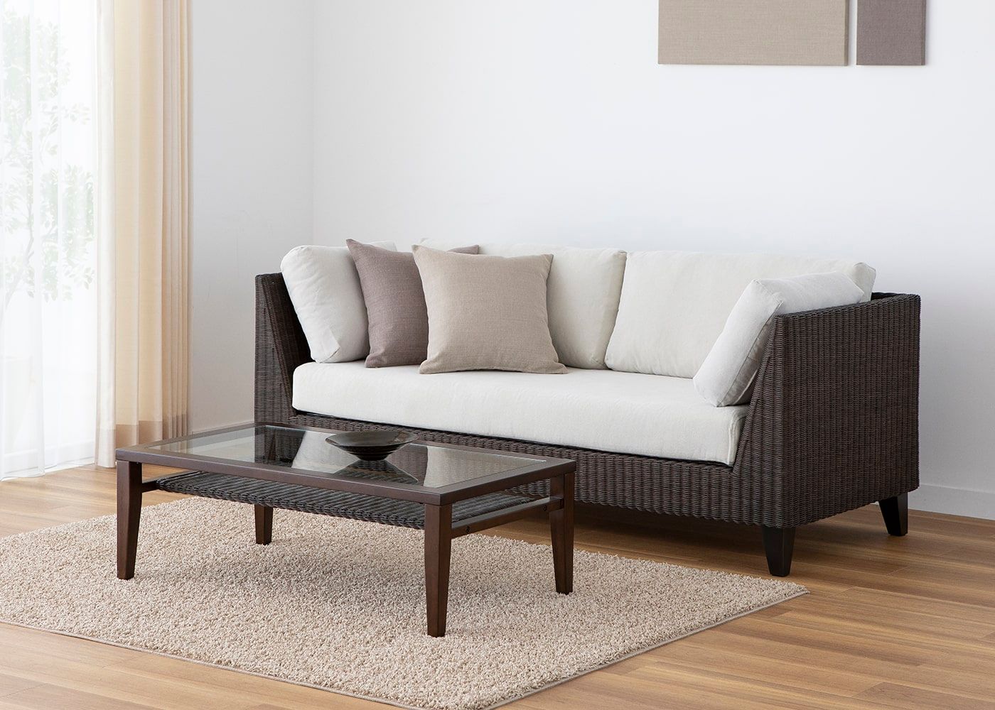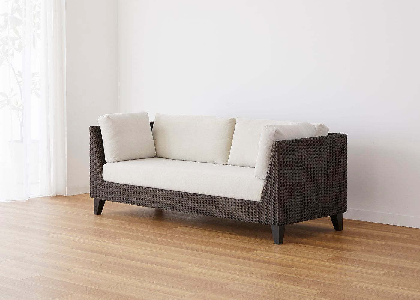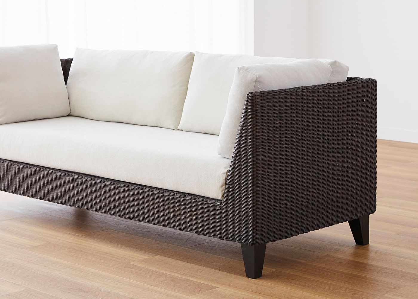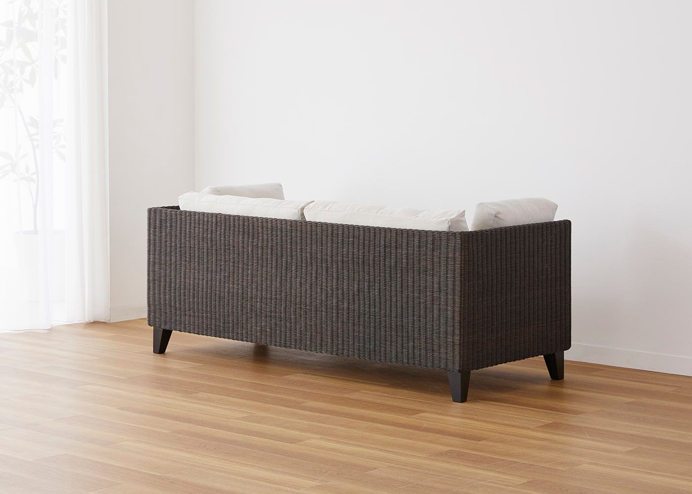 前面はもちろんのこと、背面やアーム側面などソファフレーム全体に編み込まれたラタン。丁寧に編み込まれた素材感や、光の当たり方による陰影などを視覚的に楽しむことができます。