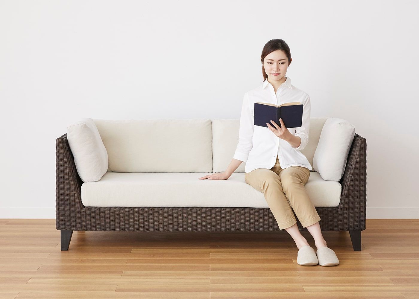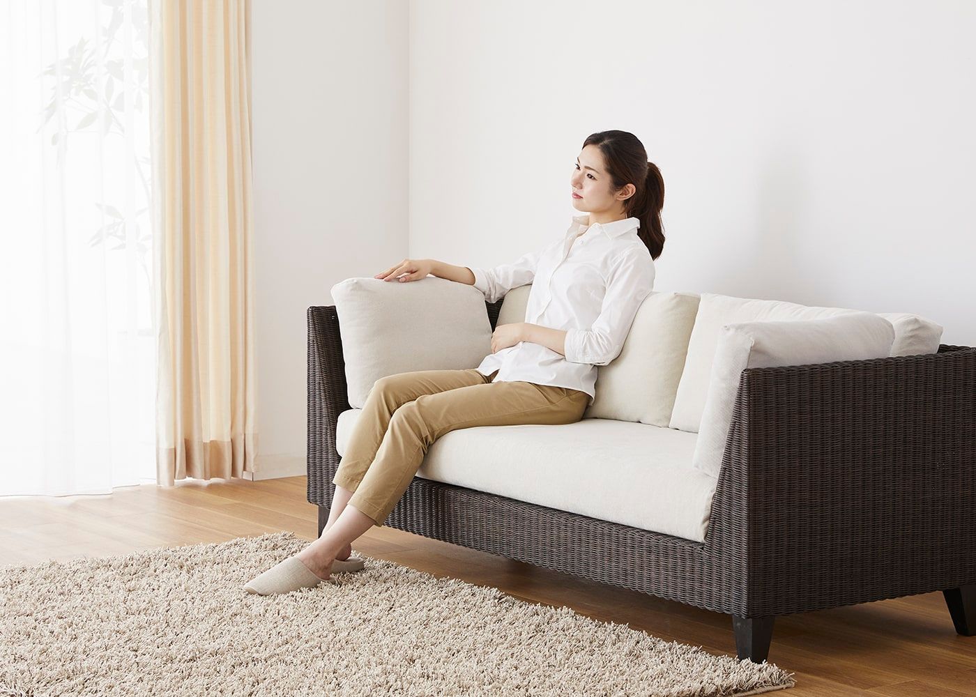 奥行き750mmのソファは、正しい姿勢で快適に身体を預けることができ、長時間座っていても疲れにくいです。座面の深さが絶妙で、リラックスしたひとときをサポートします。(モデルは身長167cmの女性)