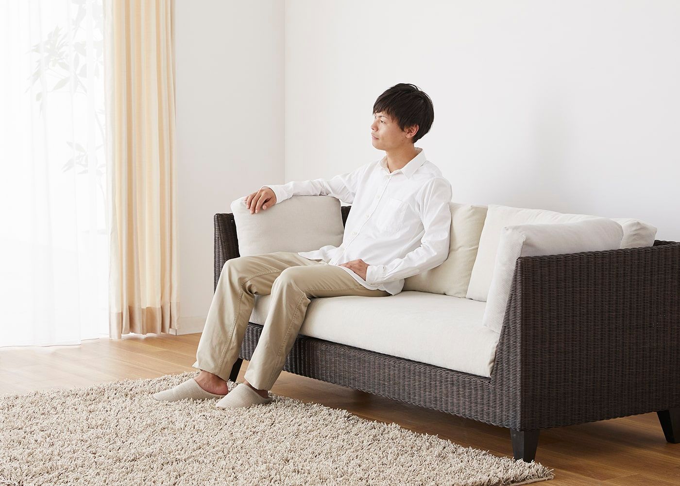 座の奥行きがコンパクトなソファに男性が座ると、より腰や背中がフィットして安定感のある座り心地になります。(モデルは身長172cmの男性)