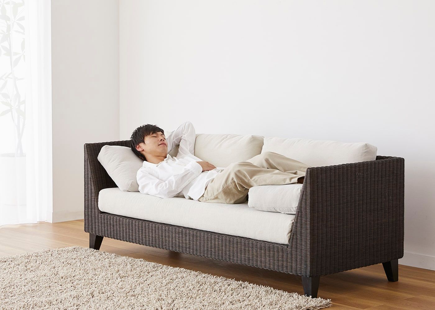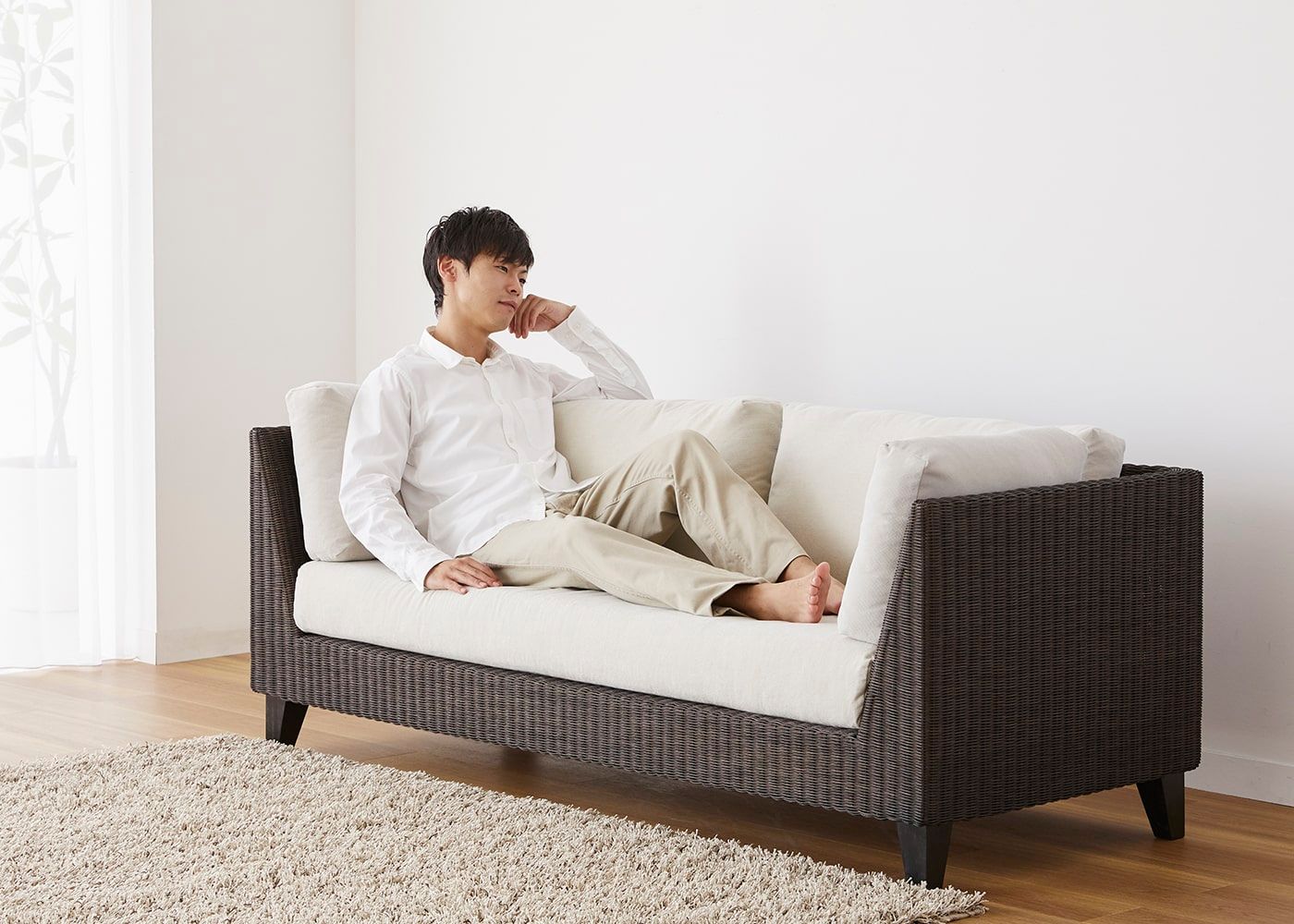 コンパクトなソファでも「ソファでちょっとお昼寝」ができるのが魅力です。さらにバッククッションを外すと座面が広くなり、よりゆったりとしたスペースで寛げます。(モデルは身長172cmの男性)