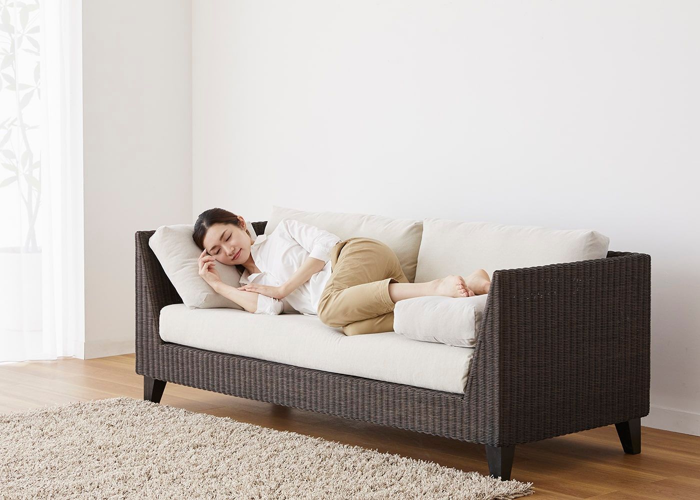 サイドクッションを枕にして、横になることもできます。日中のちょっとした休憩や昼寝にも最適で、心地よいひとときを提供します。(写真はセット 2P右アーム。モデルは身長167cmの女性)