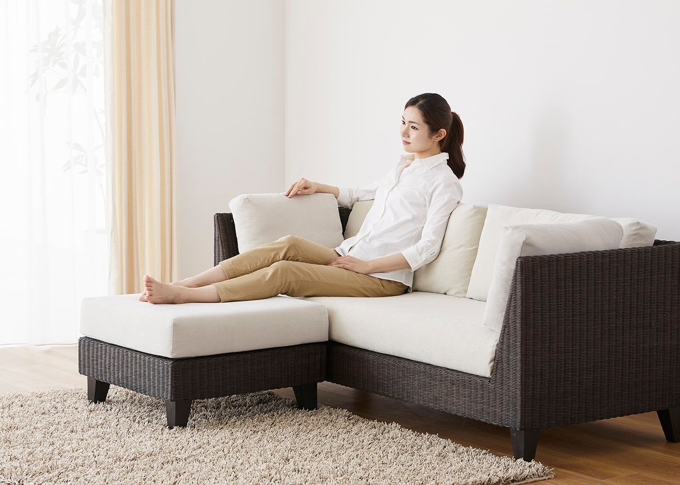 オットマンをソファ前に置き、脚を伸ばして座ることでリラックスできます。座面が腰から足先まで支え、体圧を分散するため、長時間でも快適に過ごせます。(モデルは身長167cmの女性)