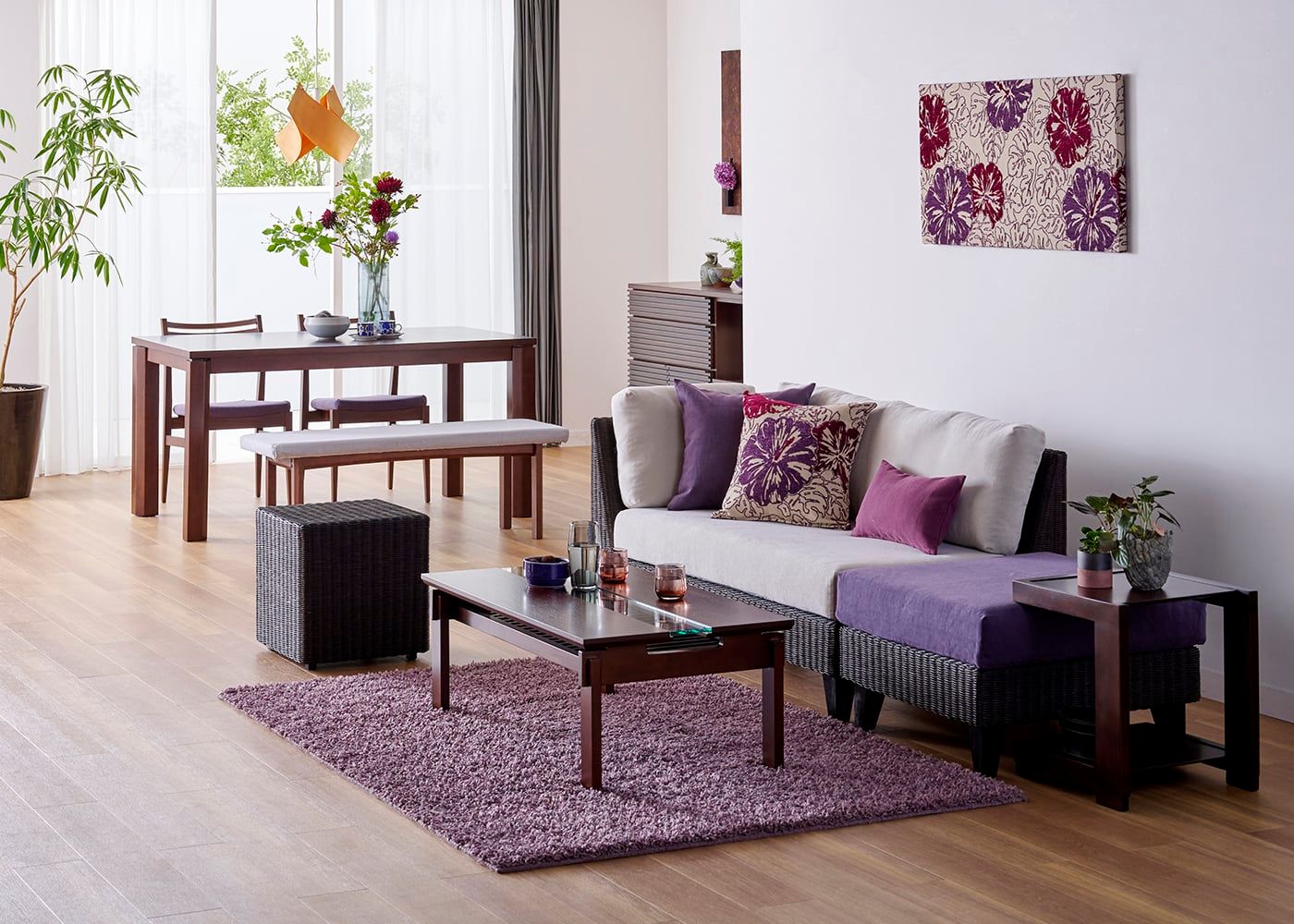「ゆとりある生活動線の実現」と「様々な座りかたで寛げる」を追求したラン・コンパクトソファのv01セット。