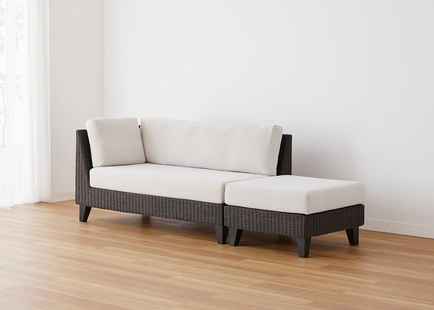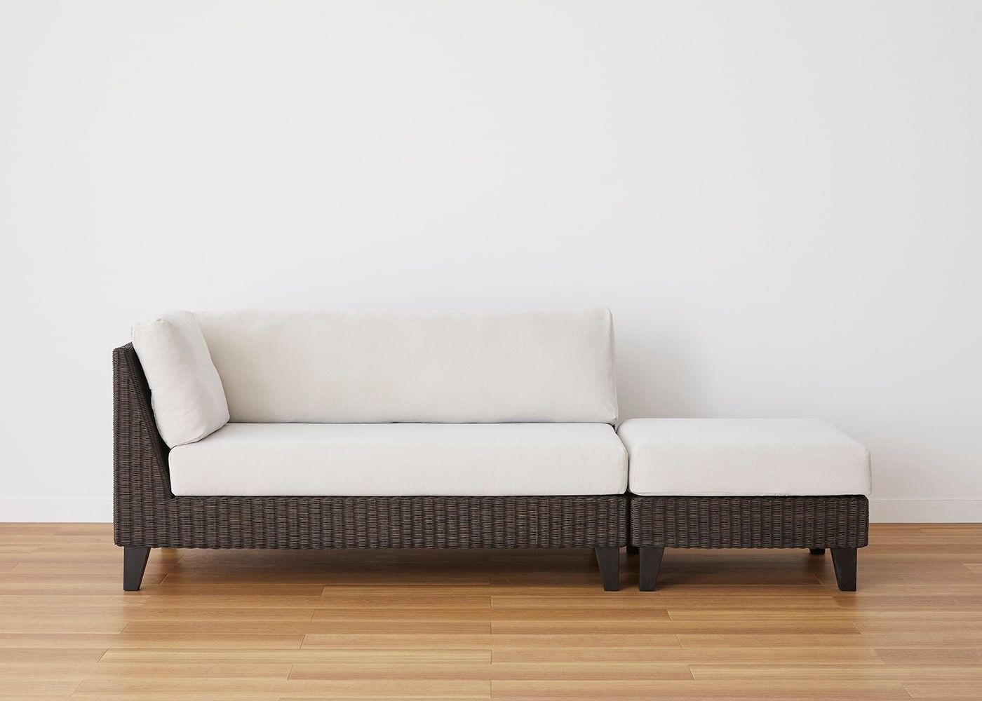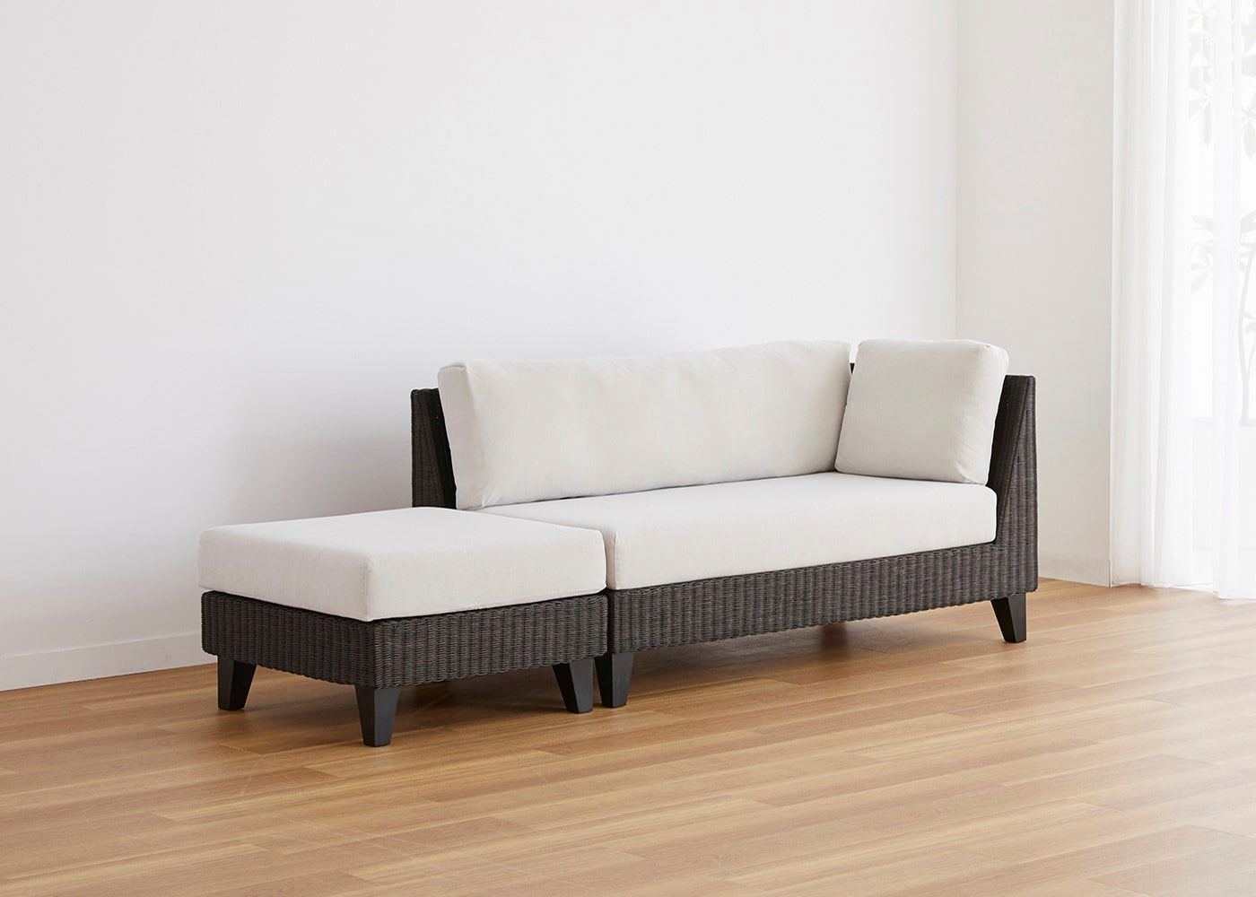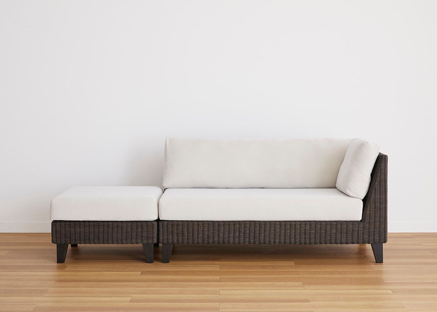 オットマンと組み合わせることで片側に抜けがあるすっきりとしたアシンメトリーなデザインが特長です。省スペースでも置けるコンパクトサイズとラタンの素材感が魅力の、アジアの風を感じさせるソファです。