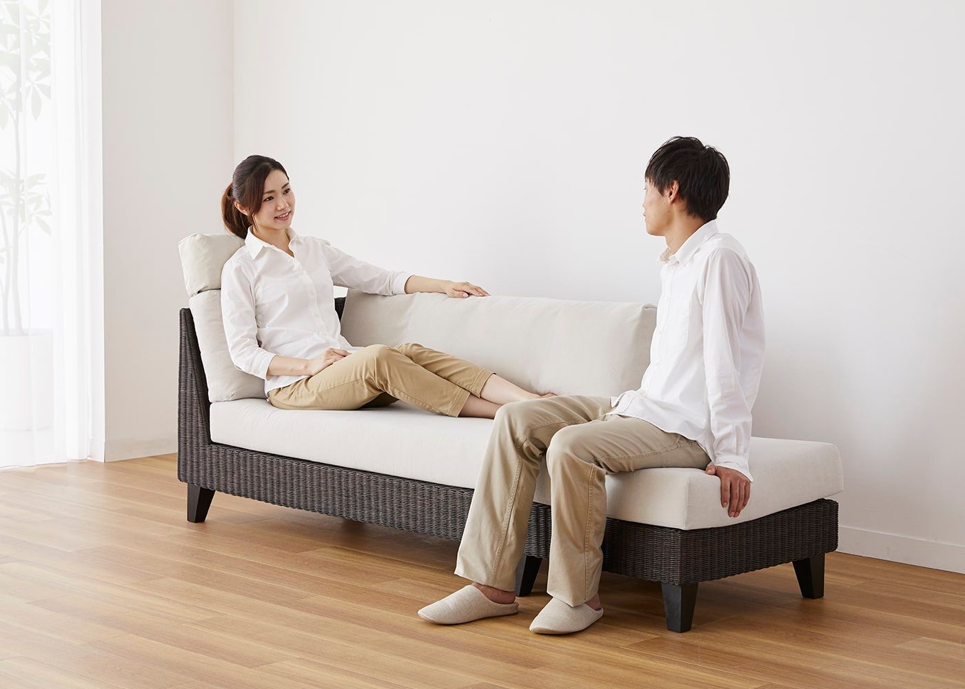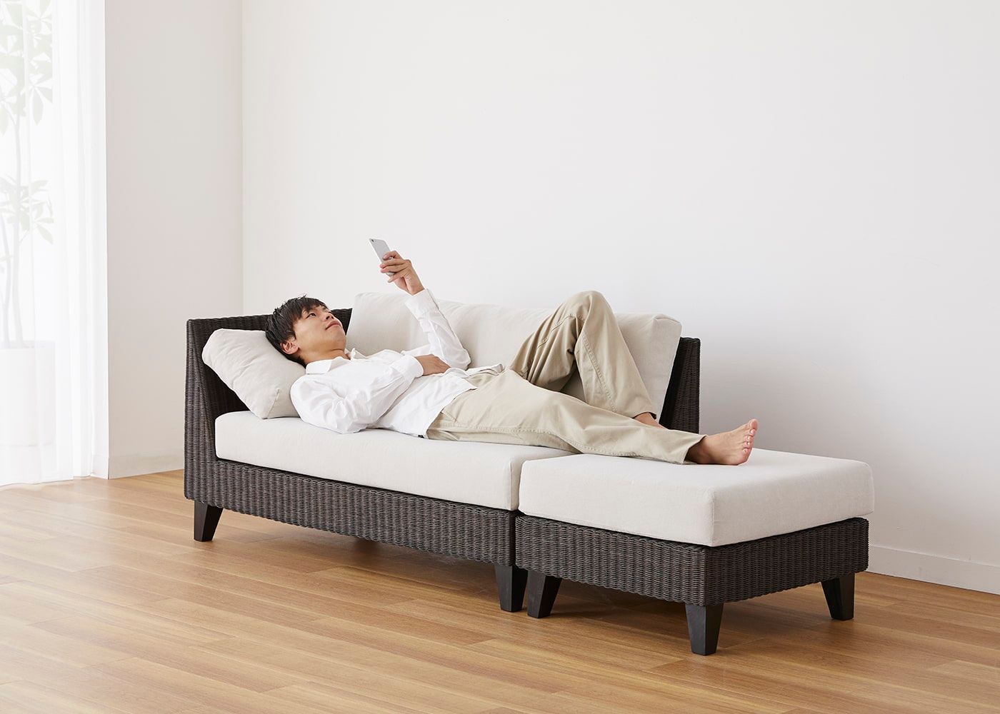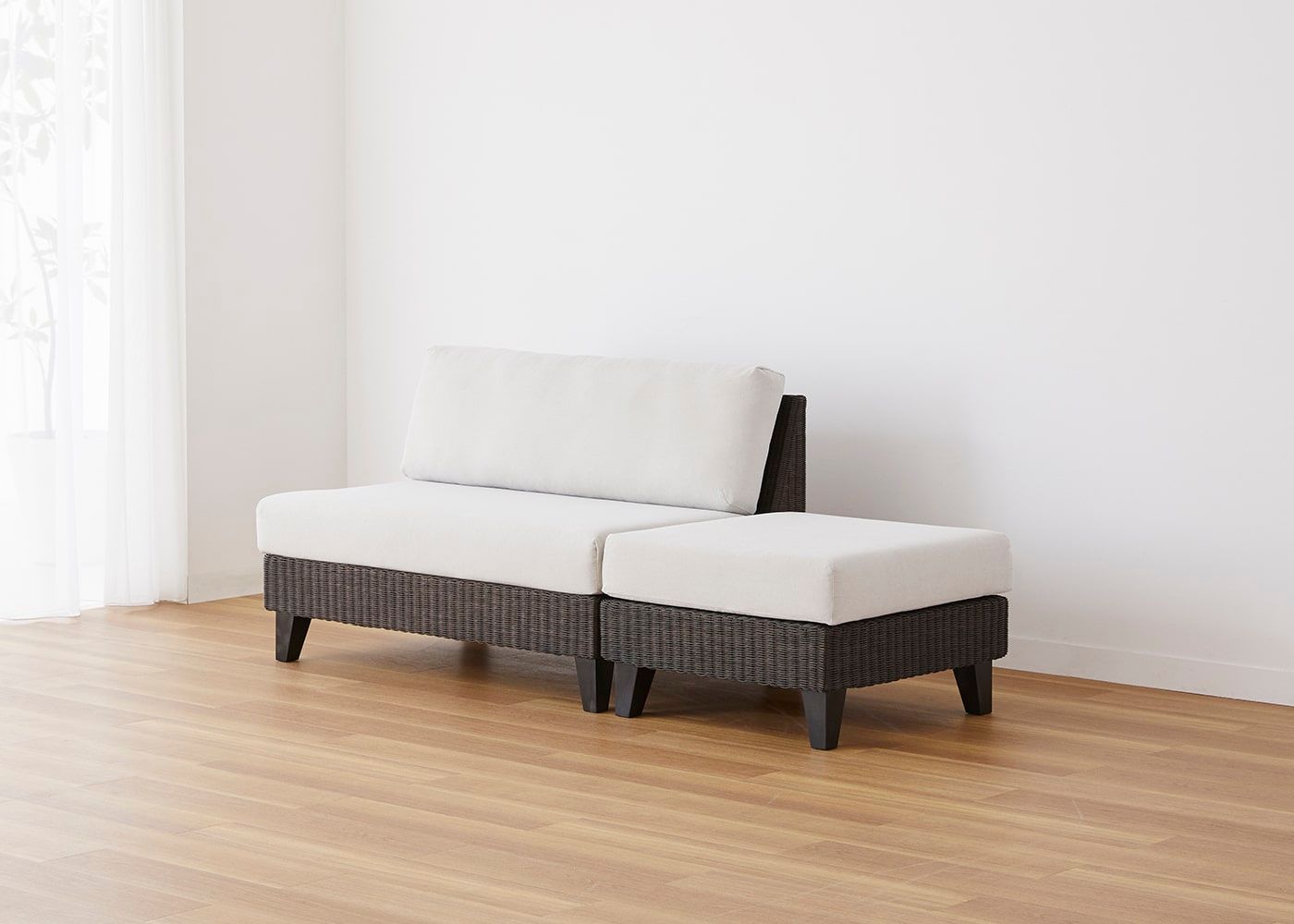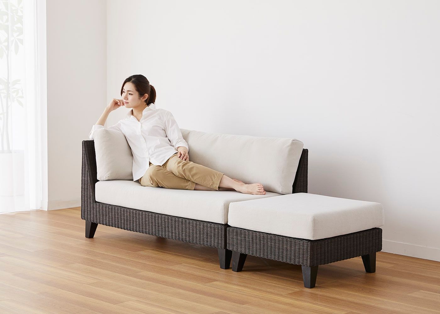 オットマンと組み合わせることで片側に抜けがあるすっきりとしたアシンメトリーなデザインが特長です。省スペースでも置けるコンパクトサイズとラタンの素材感が魅力の、アジアの風を感じさせるソファです。