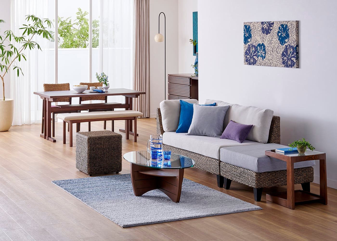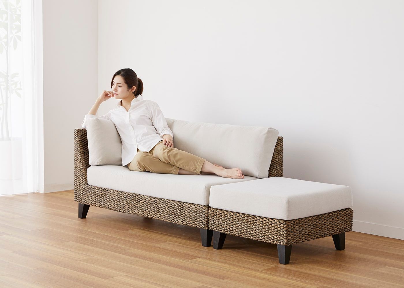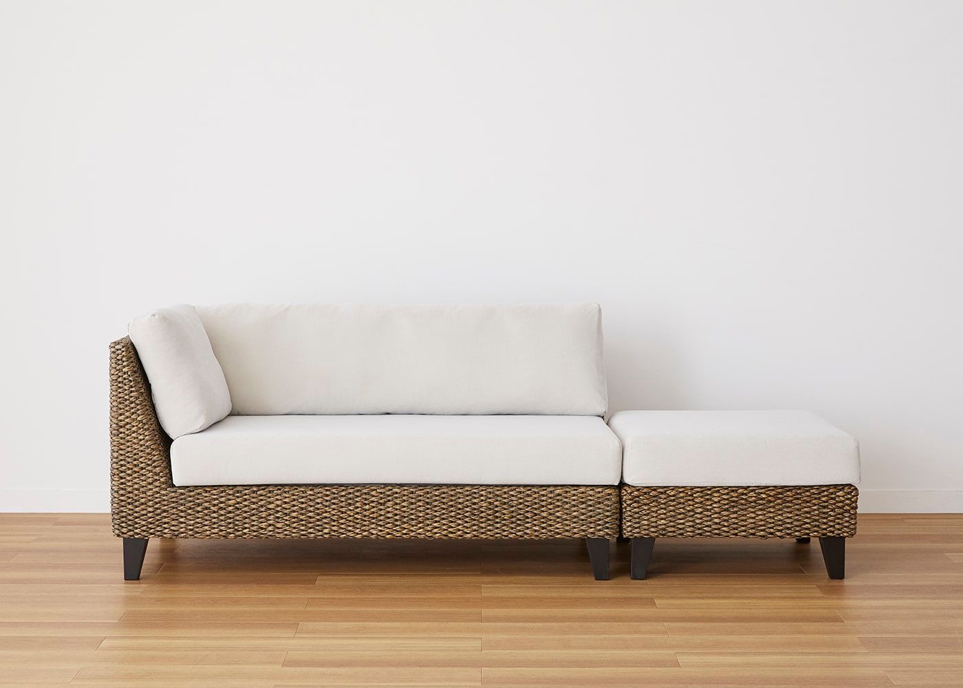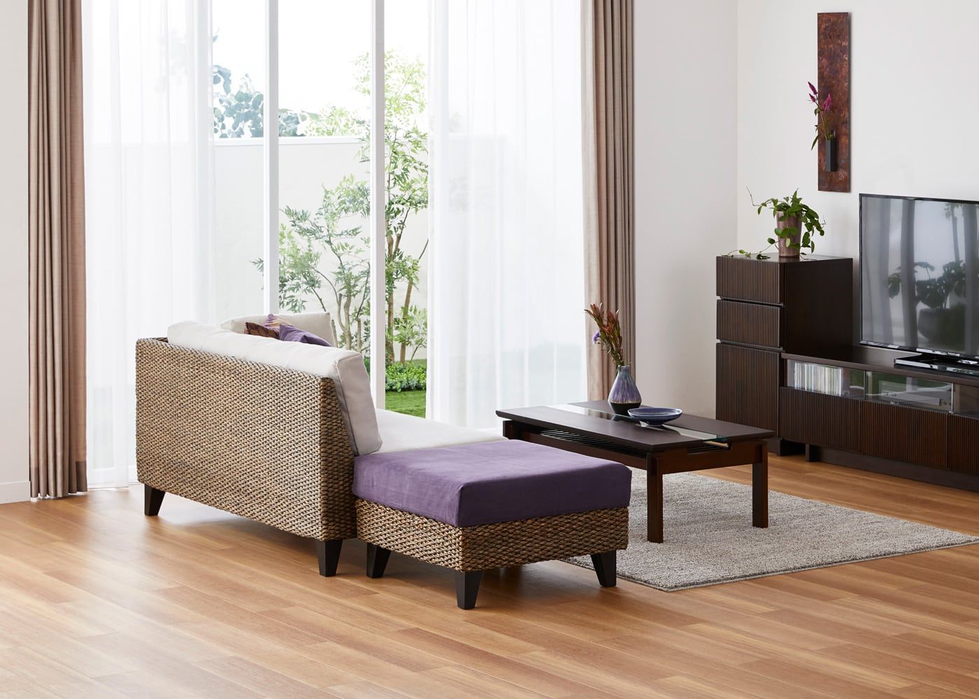 ソファをリビングルームに空間置きしても、オットマン側に抜け感が生まれて開放感のある部屋を作れます。また、綺麗に編み込まれた天然のヒヤシンス素材が空間に映えます。(写真はセット 2P左アーム)
