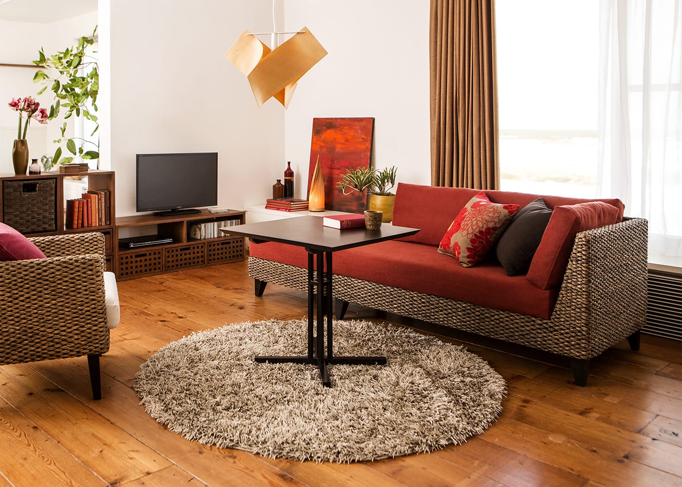 暖色系カラーでサンセットの温もりを感じるコーディネート。ラン・コンパクトソファと鮮やかな赤や橙の色合いがリゾート地のような空間を作り、好みの色で自分だけの空間を演出できます。