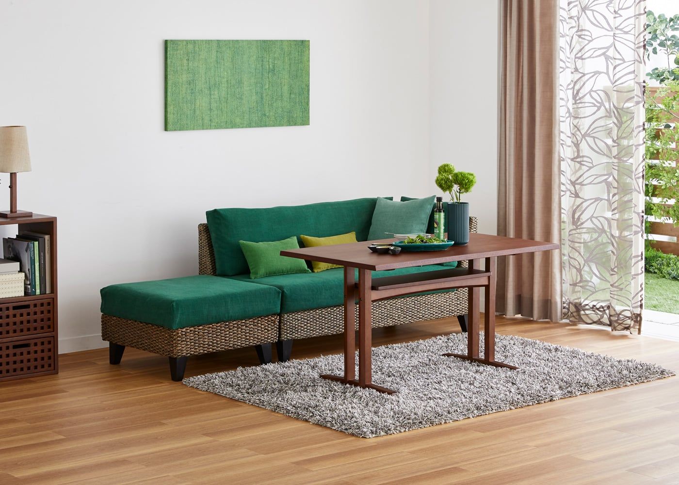 ソファダイニングテーブルと組み合わせると、ゆっくり寛いだり、食事ができたりと様々な過ごし方が楽しめる、ソファダイニングスタイルの完成です。(モデルは身長172cmの男性)