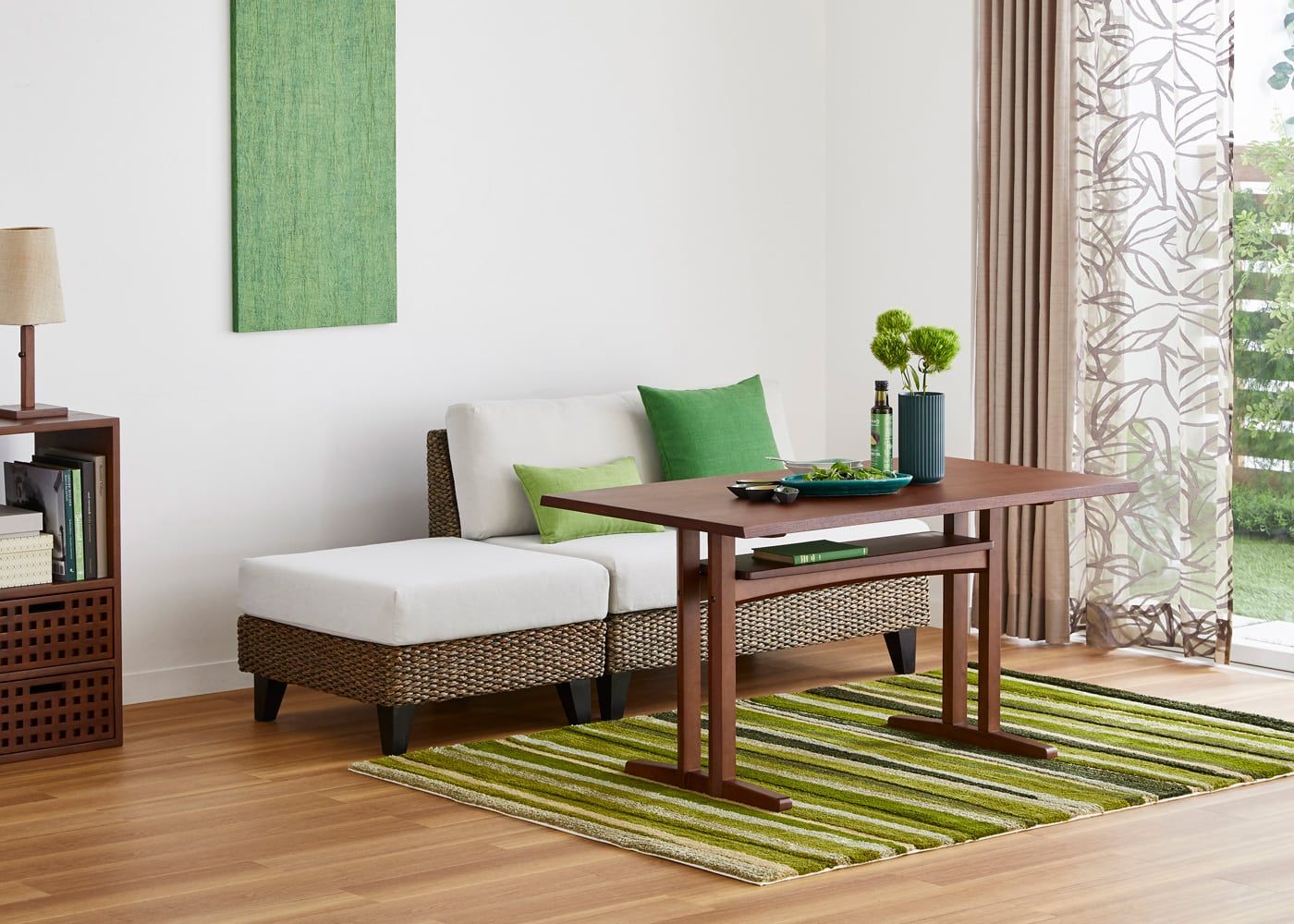 リラックスと食事の両方に最適な高さで、家族や友人とのコミュニケーションを豊かにします。多機能性を兼ね備えたこのスタイルは、生活空間を便利で心地よく演出します。(モデルは身長167cmの女性)