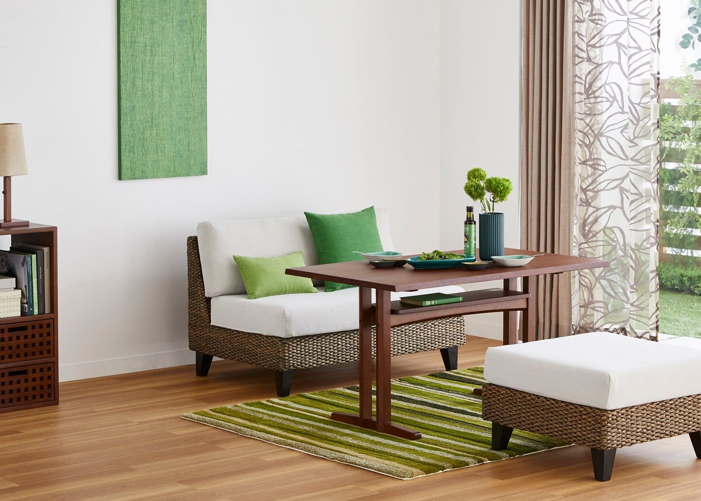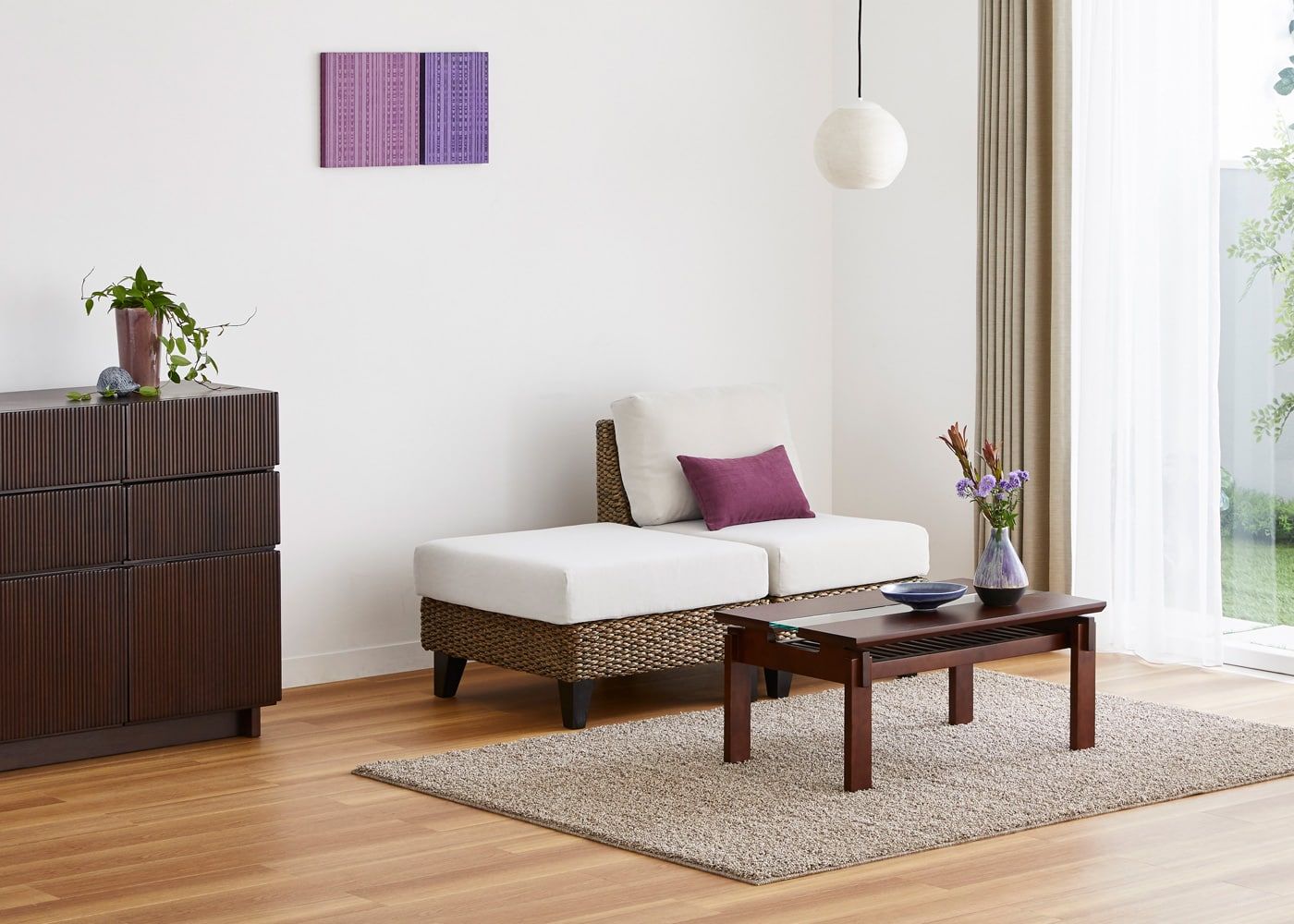 「ゆとりある生活動線の実現」と「様々な座りかたで寛げる」を追求したラン・コンパクトソファのv01セット。片側に抜けのあるアジアンリゾートのような開放的な空間を演出してくれます。(写真はセット 2P左アーム)