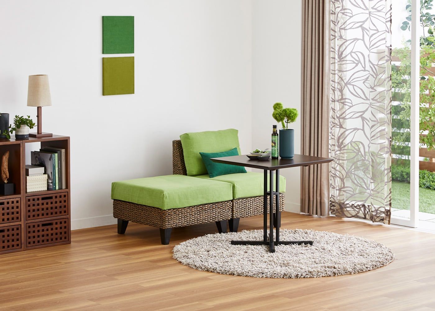 1Pベンチとオットマンをセパレートして使えばカフェ風の空間も作れます。ソファカバーもお好みのカラーに変えて、爽やかなリビングを演出してみましょう。(写真はセット 1Pベンチと
