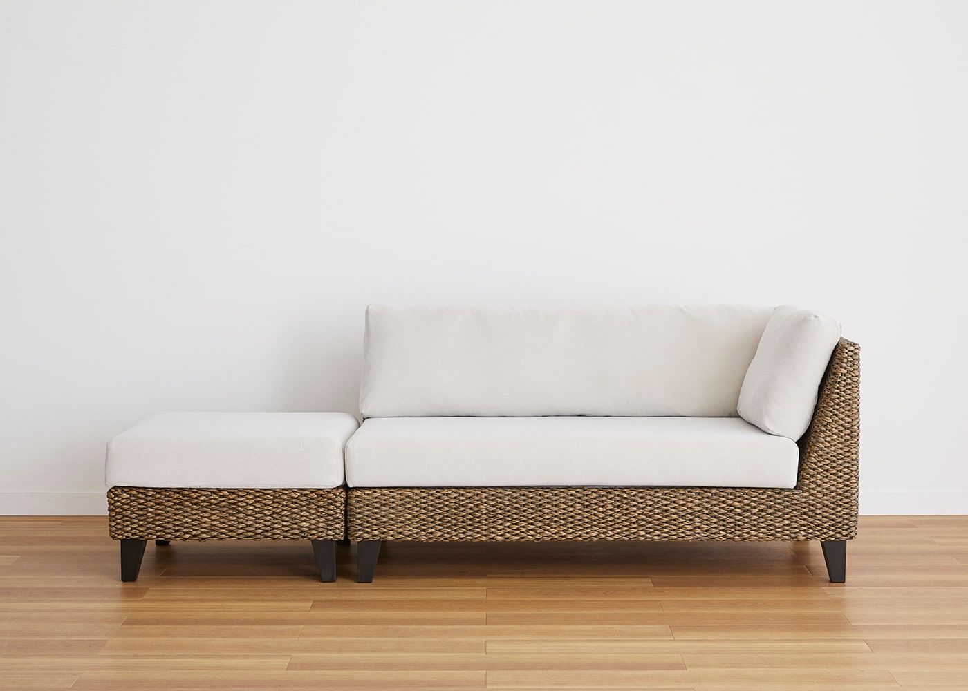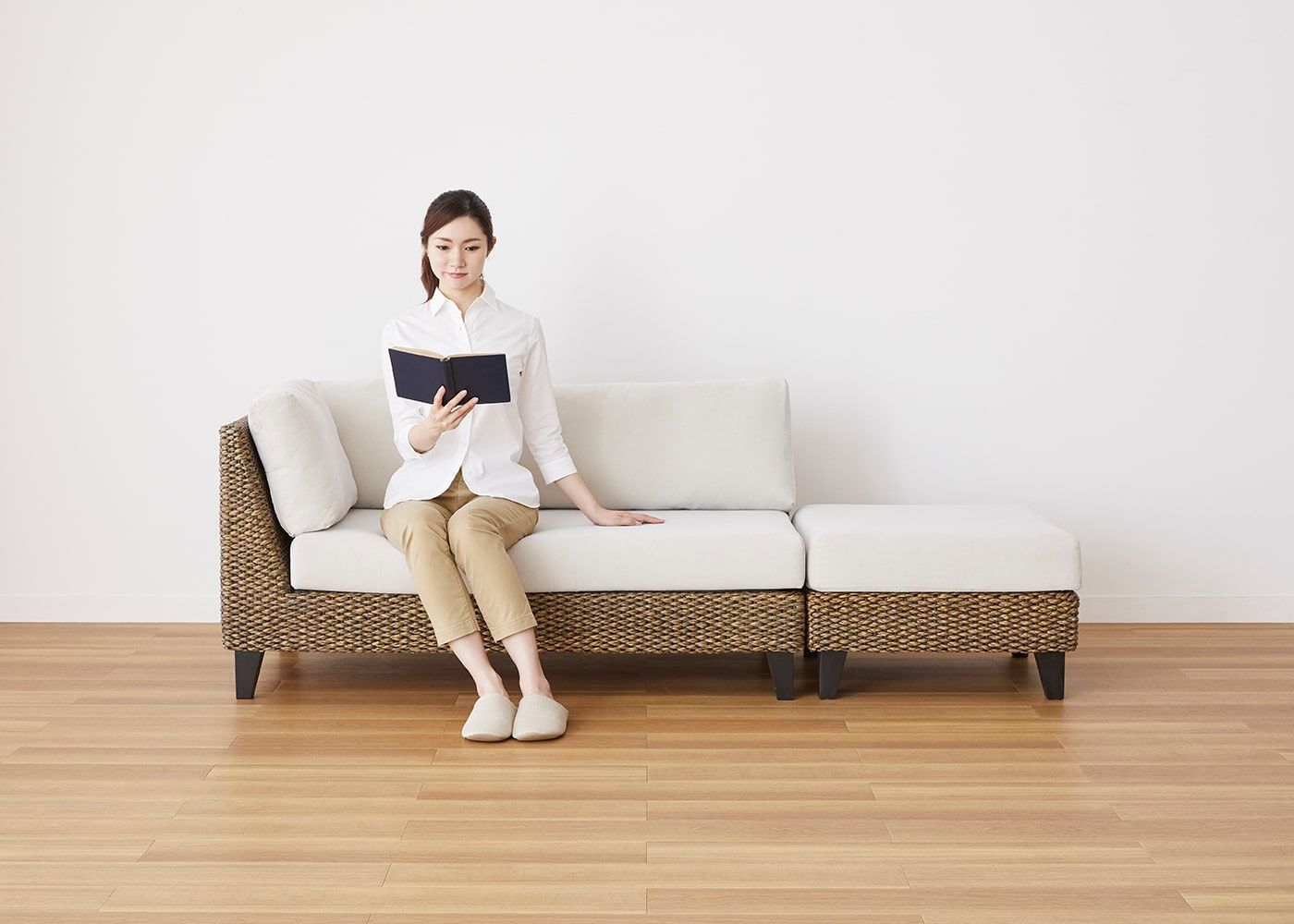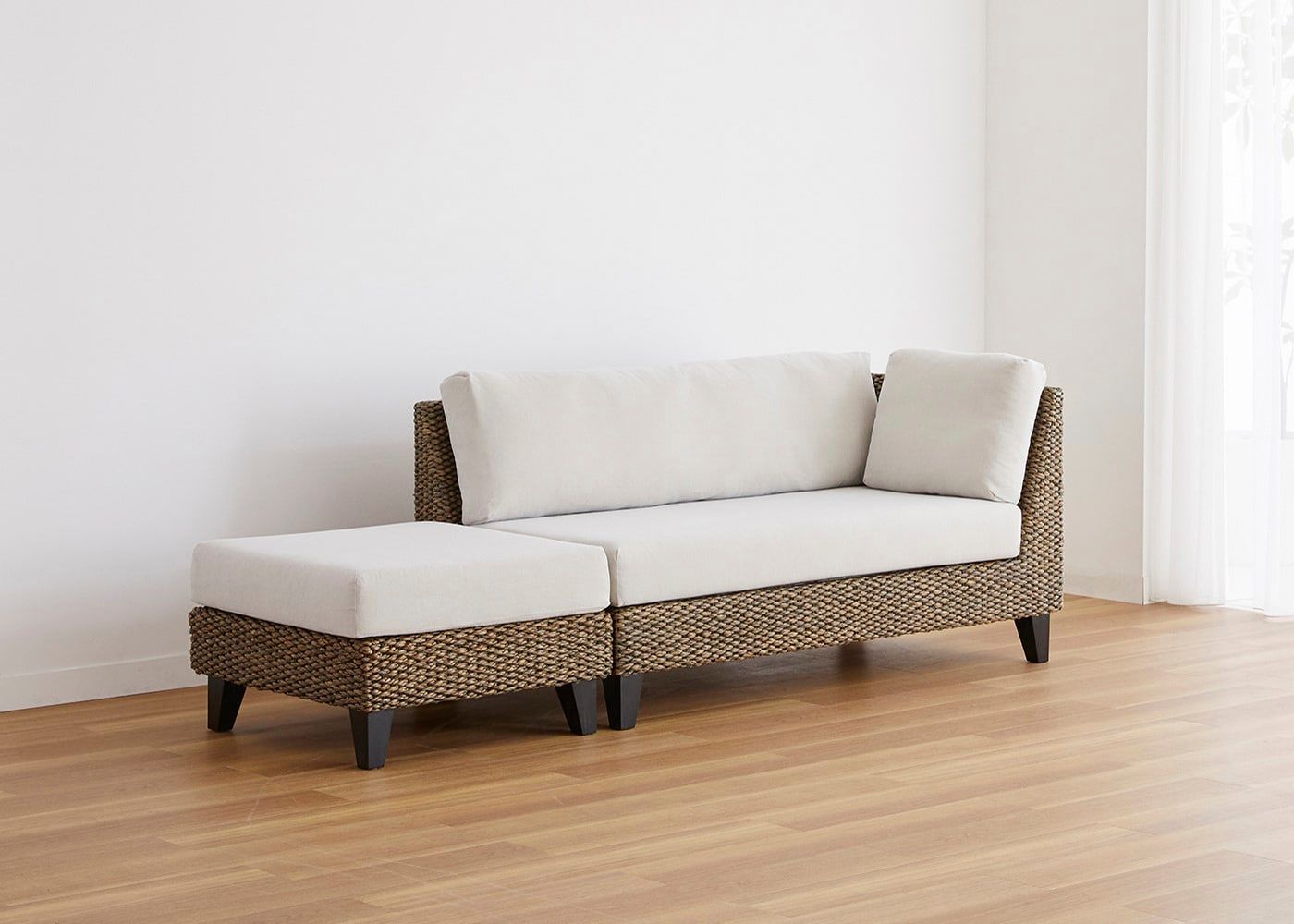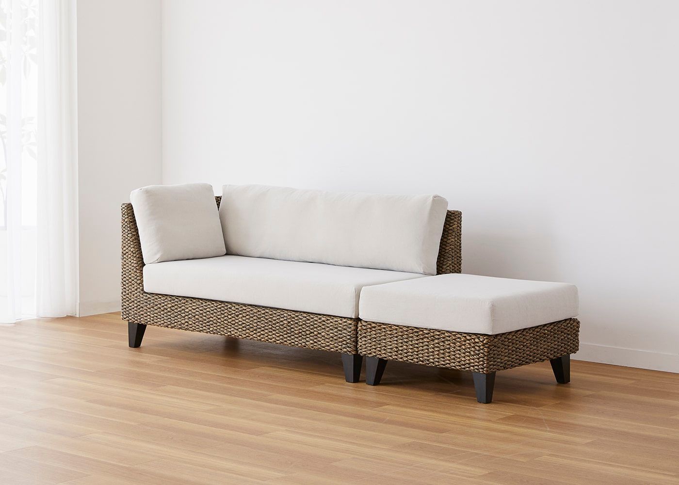 ソファをリビングルームに空間置きしても、オットマン側に抜け感が生まれて開放感のある部屋を作れます。また、綺麗に編み込まれた天然のヒヤシンス素材が空間に映えます。(写真はセット 2P左アーム)