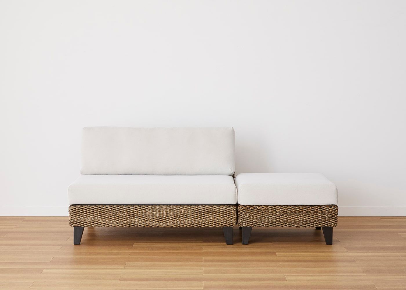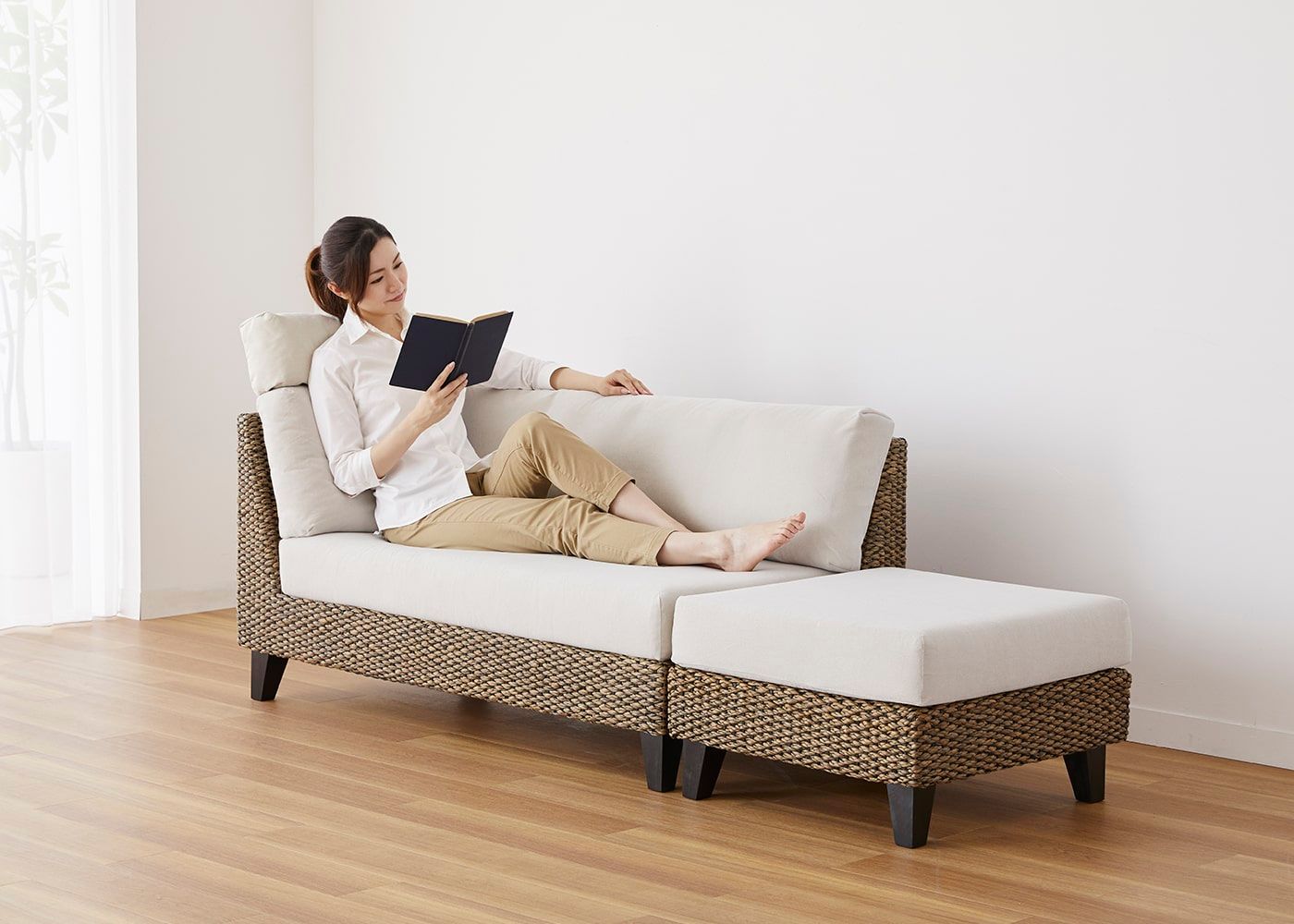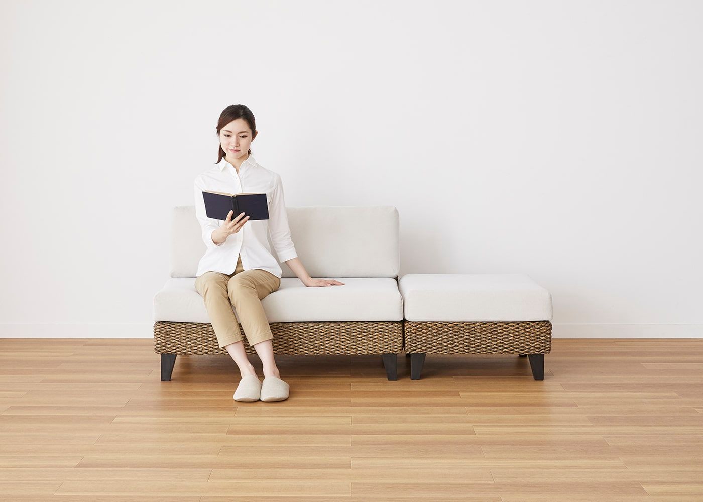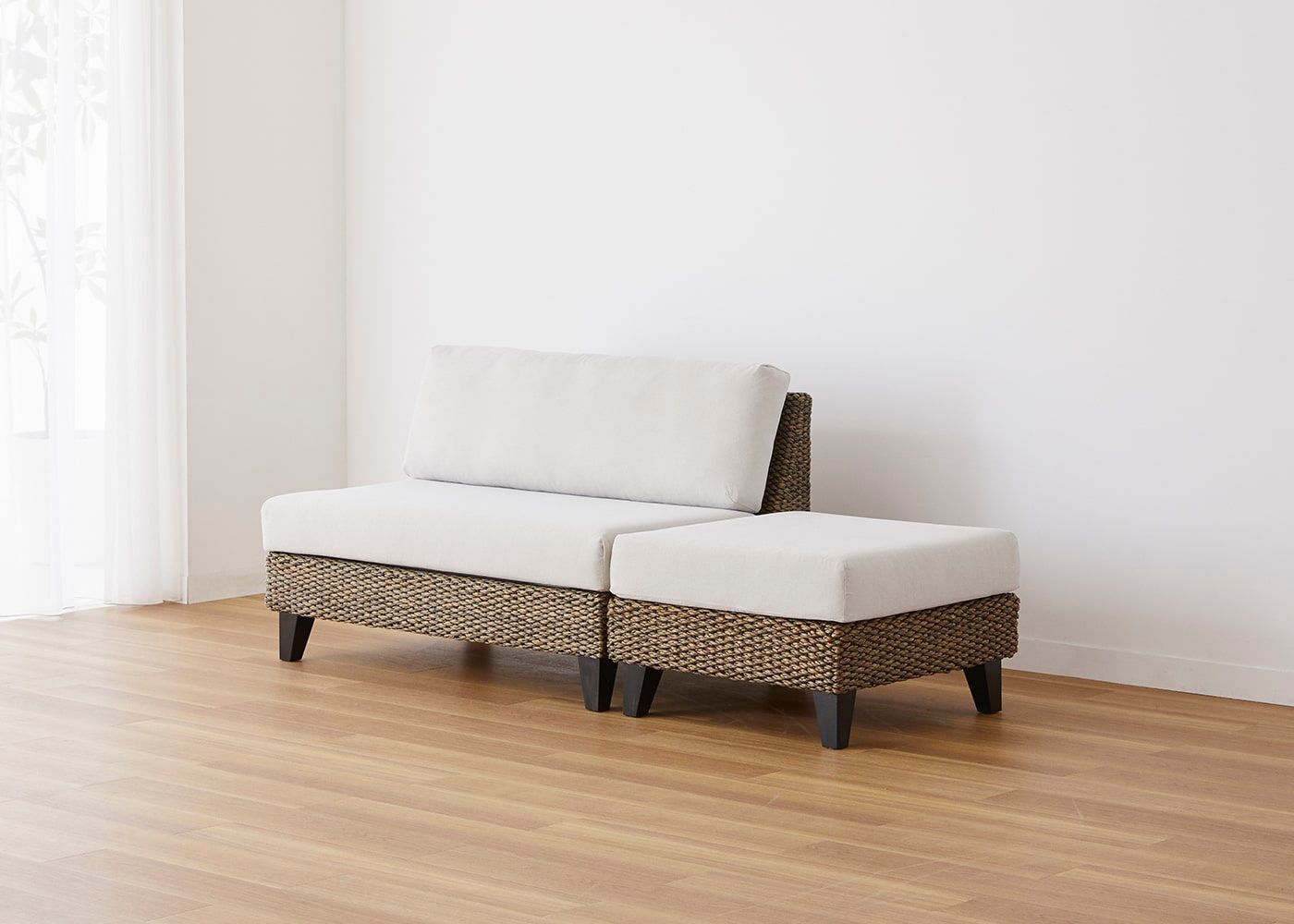 ソファをリビングルームに空間置きしても、オットマン側に抜け感が生まれて開放感のある部屋を作れます。また、綺麗に編み込まれた天然のヒヤシンス素材が空間に映えます。(写真はセット 2P左アーム)