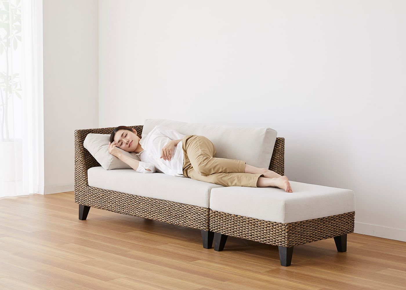 サイドクッションを枕にして、横になることもできます。日中のちょっとした休憩や昼寝にも最適で、心地よいひとときを提供します。(写真はセット 2P右アーム。モデルは身長167cmの女性)