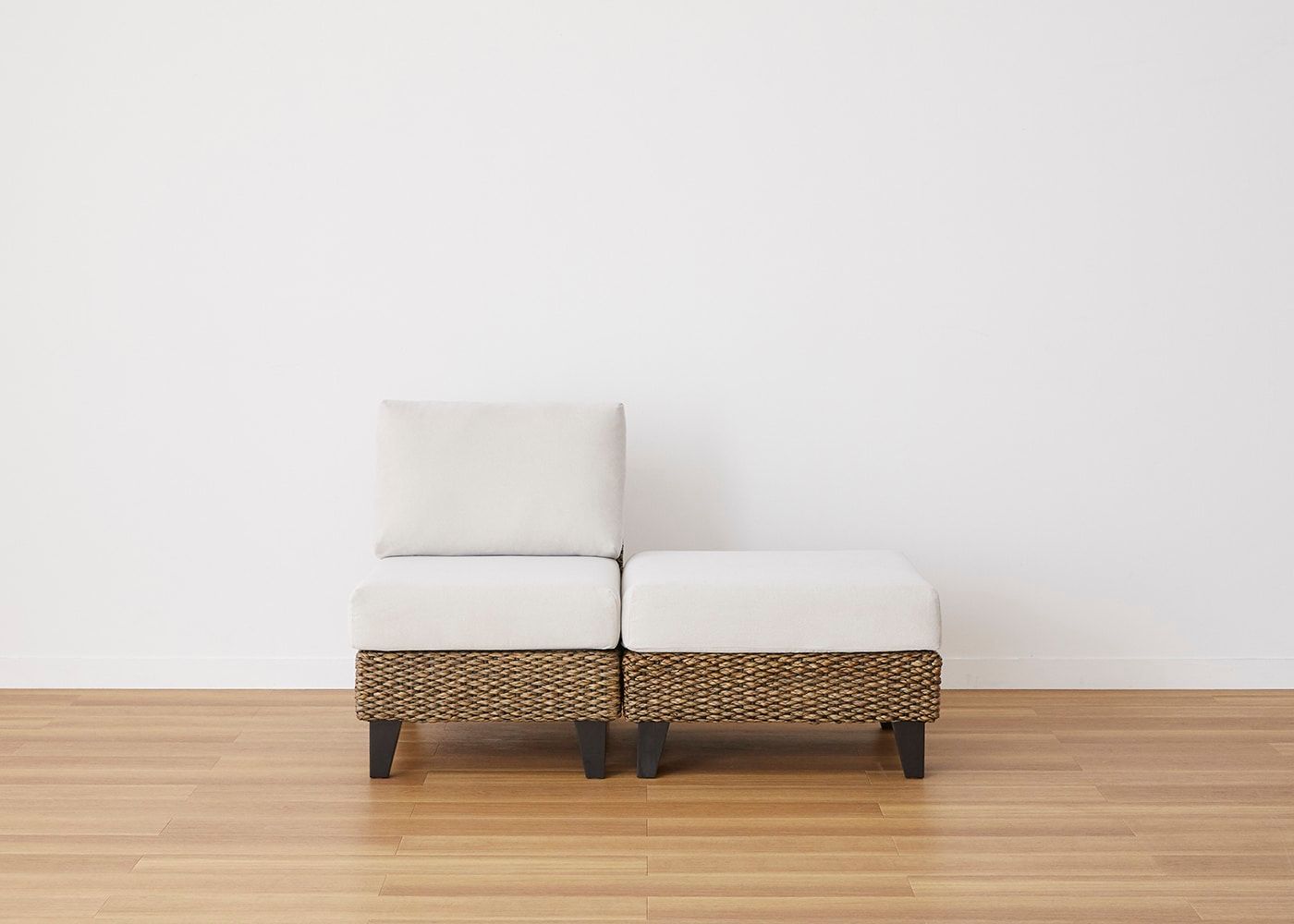 1人掛けのベンチとオットマンのセット。オットマンを横に置くと、2人掛けソファとしてお使いいただけます。また、位置を変えることで、足まで支えるソファに変化し、使用シーンに応じたアレンジが可能です。(写真はセット 1Pベンチ)