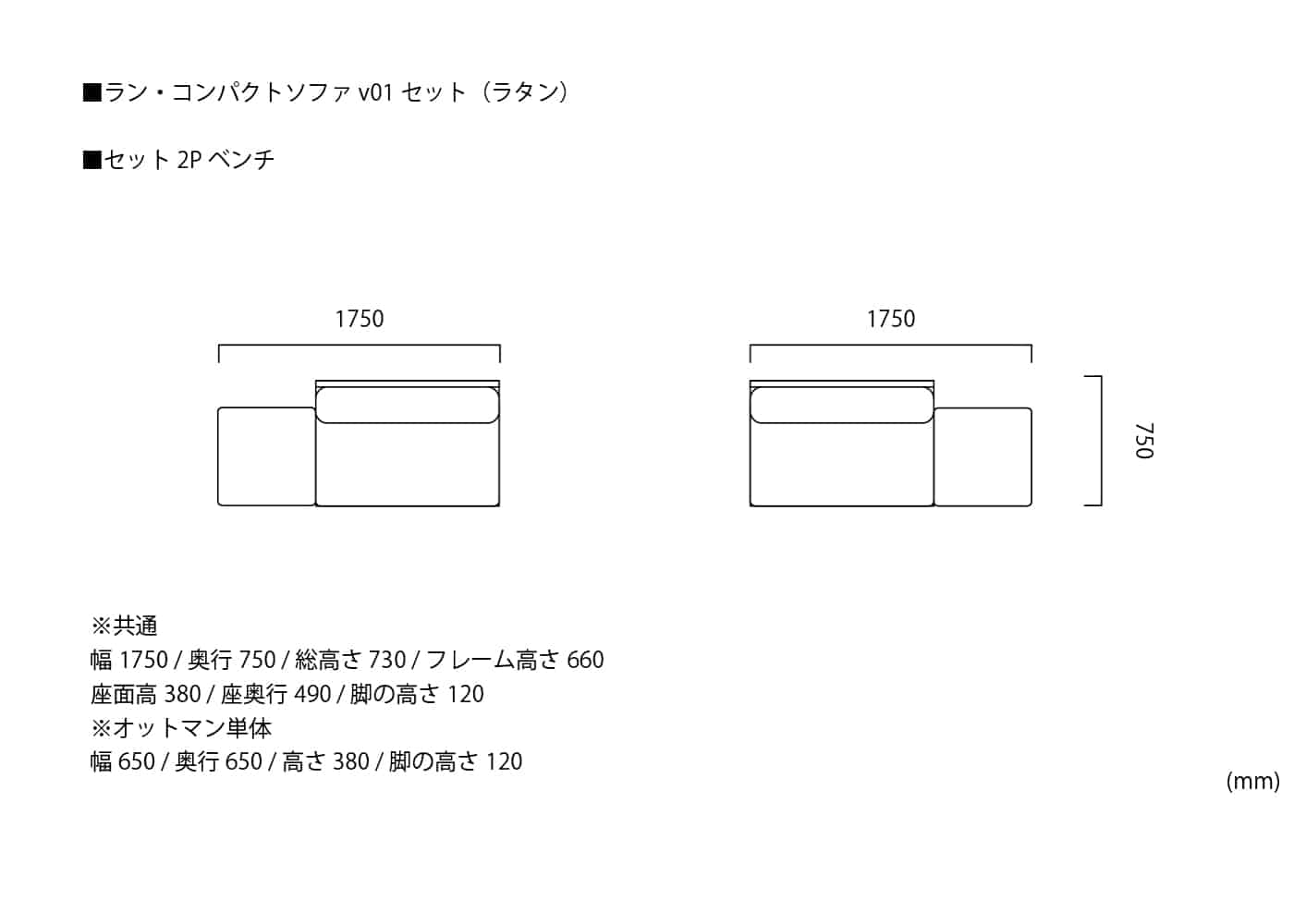 幅1750 / 奥行750 / 高さ730 / 座面高380 / 座奥行 490