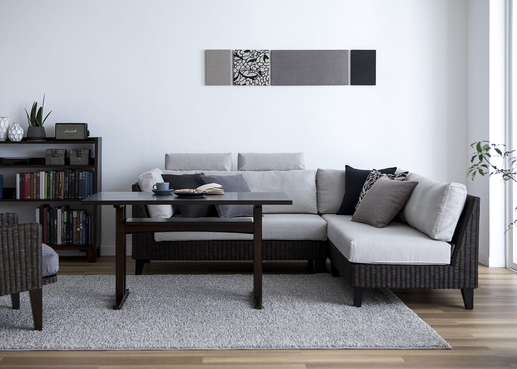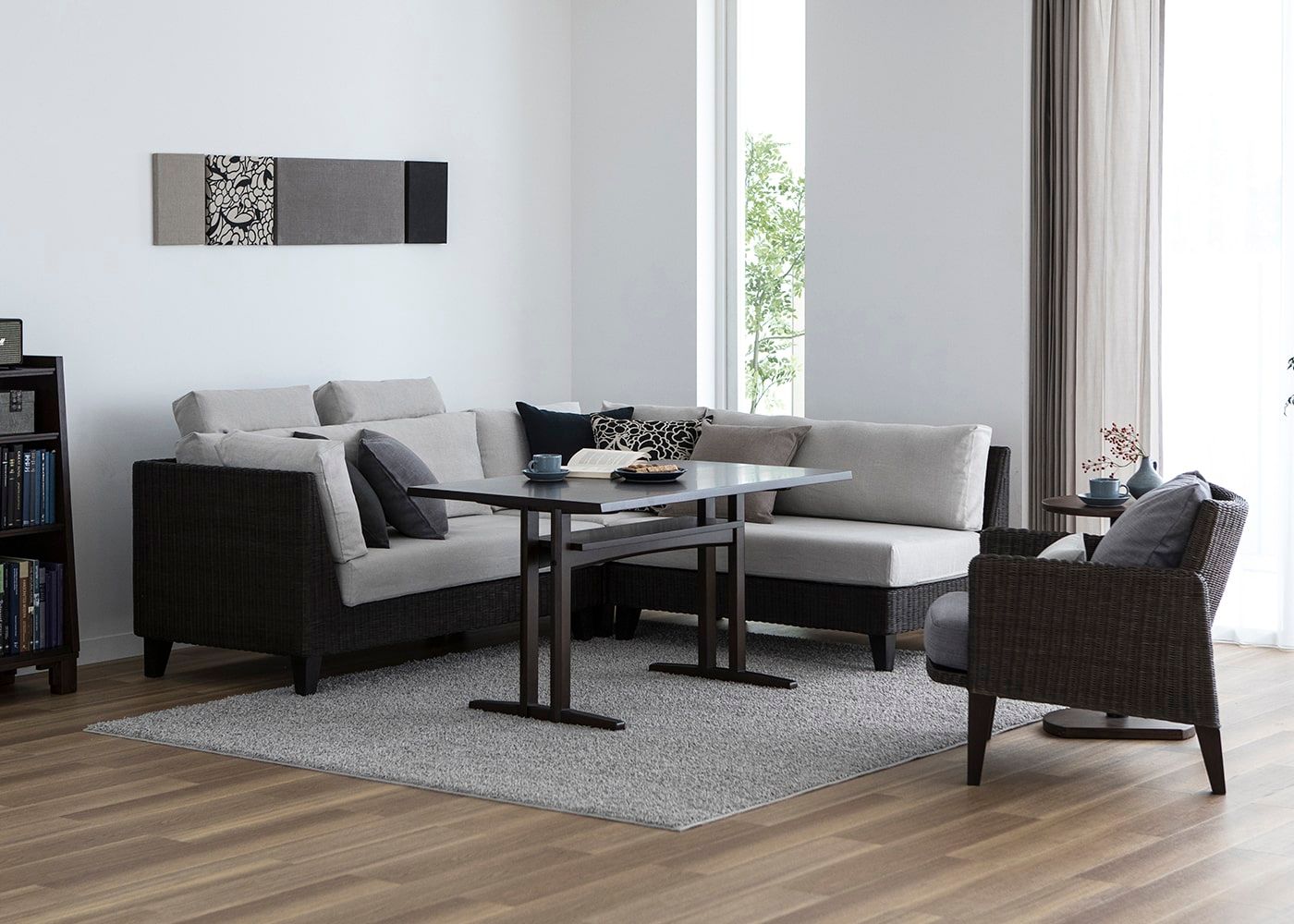 優しいグレーのカラーコーディネートと、それを引き立てる家具が印象的な空間を作り上げています。ラタン素材を使用したコーナーソファと、グレーのファブリックは、ゆったりとリラックスムード溢れる空間に。