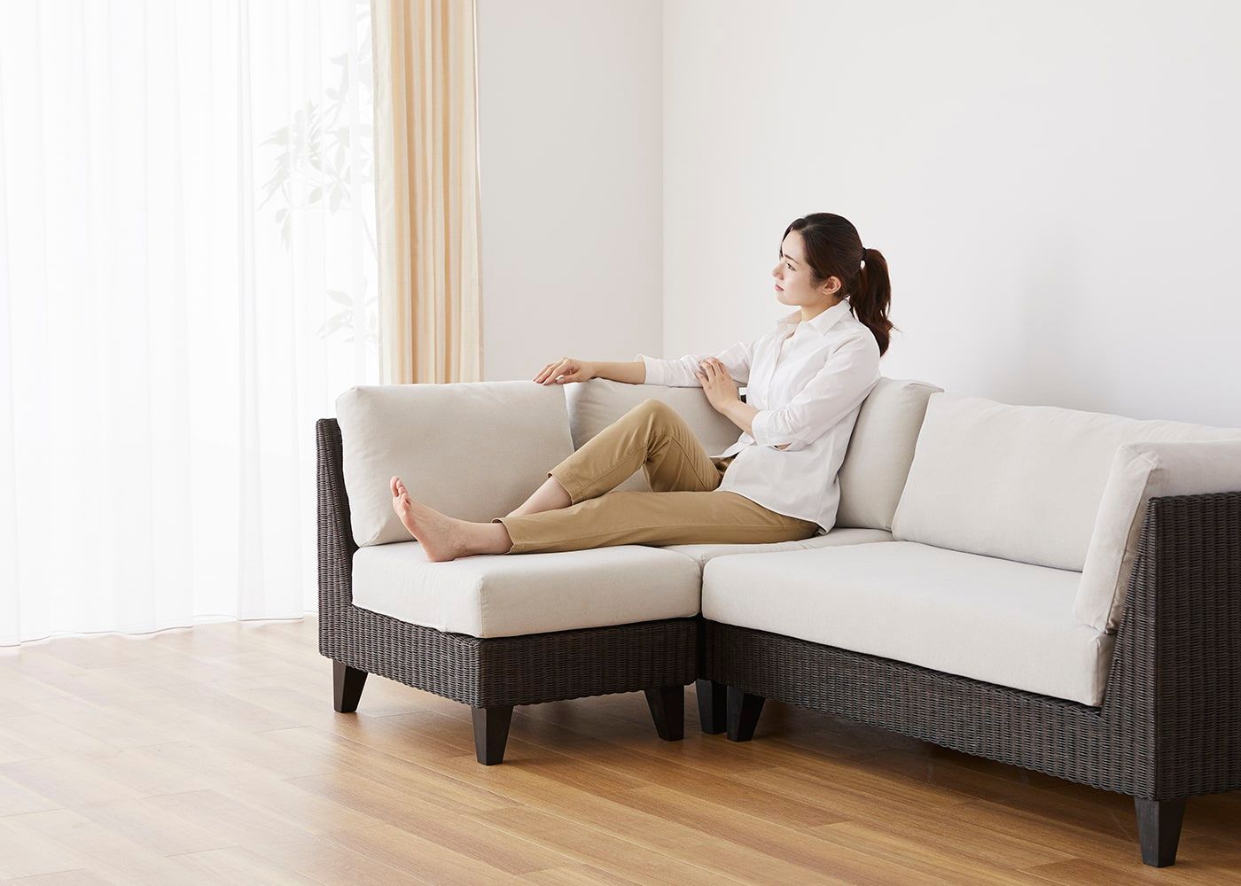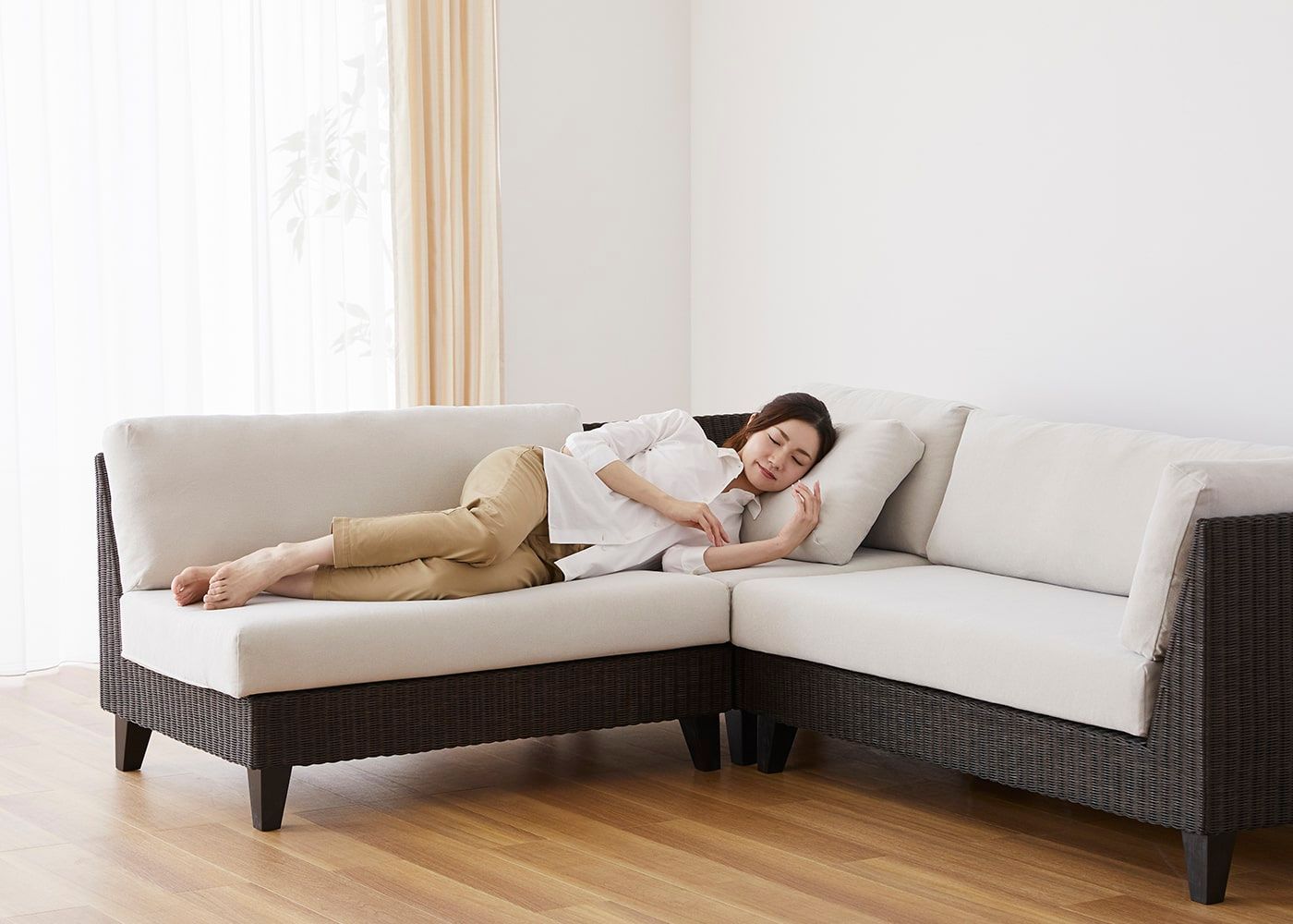 サイドクッションを枕にして、横になることもできます。日中のちょっとした休憩や昼寝にも最適で、心地よいひとときを提供します。(写真はコーナーソファセット 2P左アーム+2Pベンチ。モデルは身長167cmの女性)