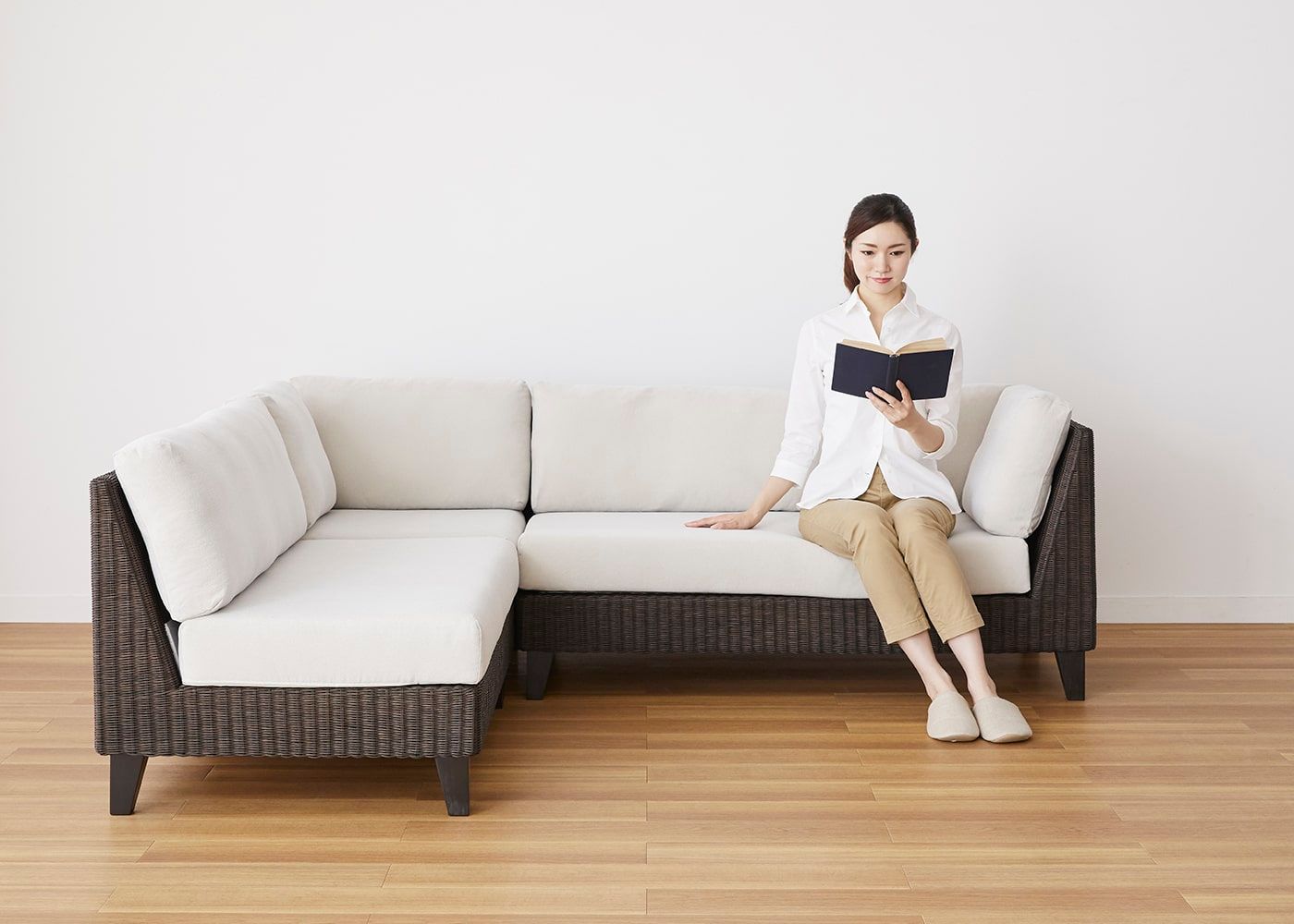 1人掛けベンチのセットでも、コーナーの角に座ってゆっくり寛ぐこともできます。(写真はコーナーソファセット 2P左アーム+1Pベンチ。モデルは身長167cmの女性)