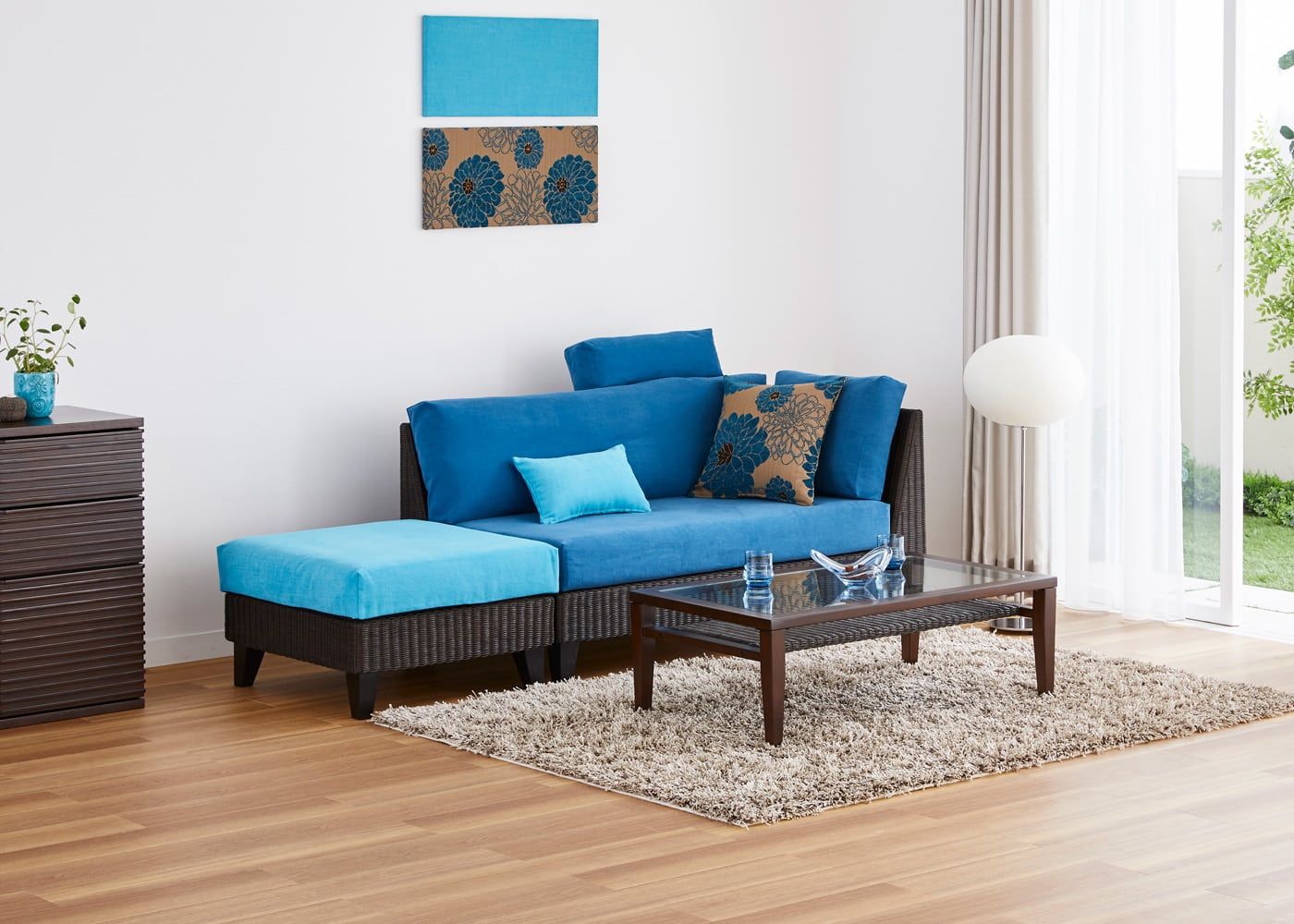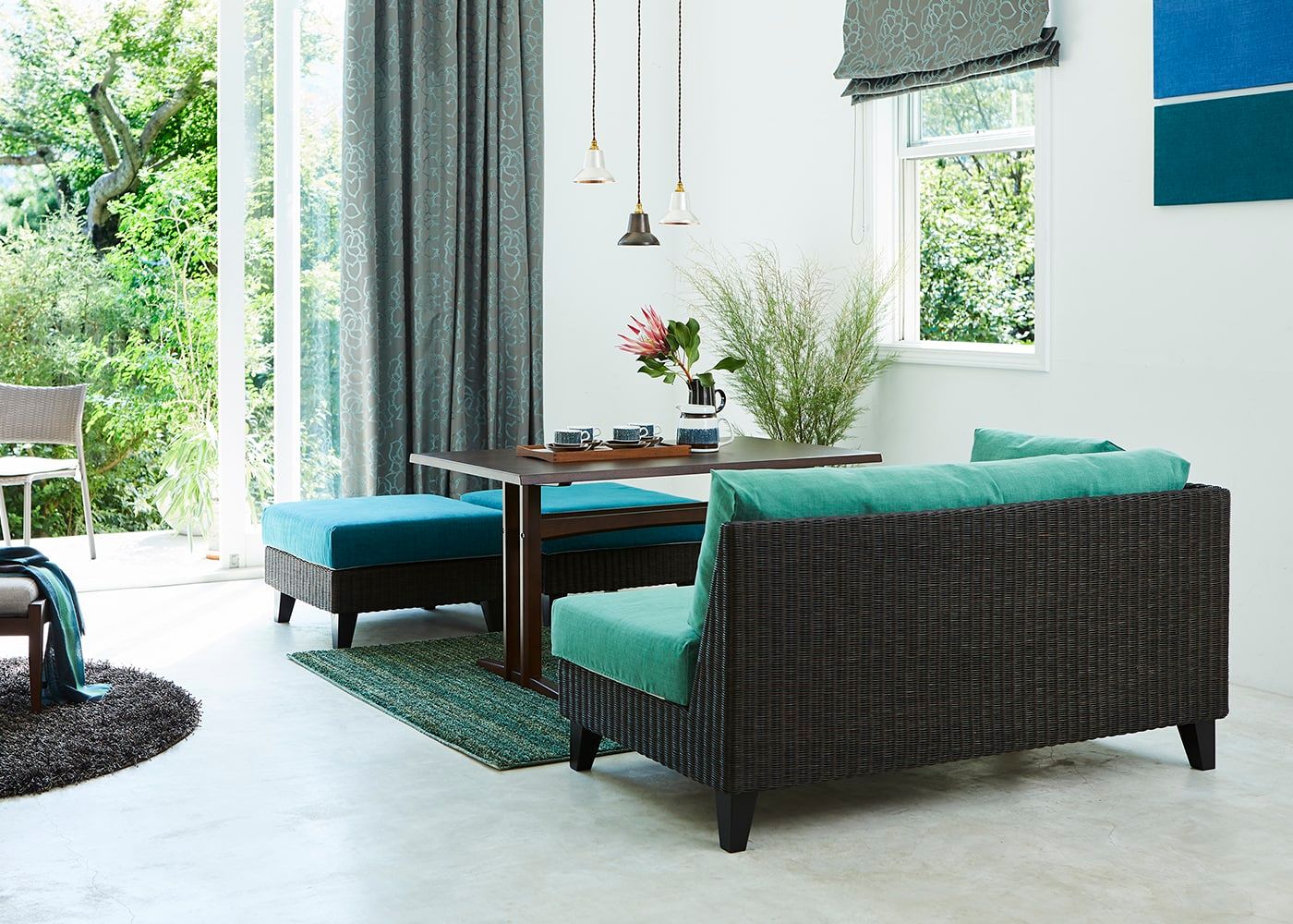 ラン・コンパクトソファ 2P片アームにオットマンを組み合わせれば、リビングダイニングでゆったりと過ごせる配置に。リゾートホテルのような特別な空間を演出できます。(写真の組み合わせは