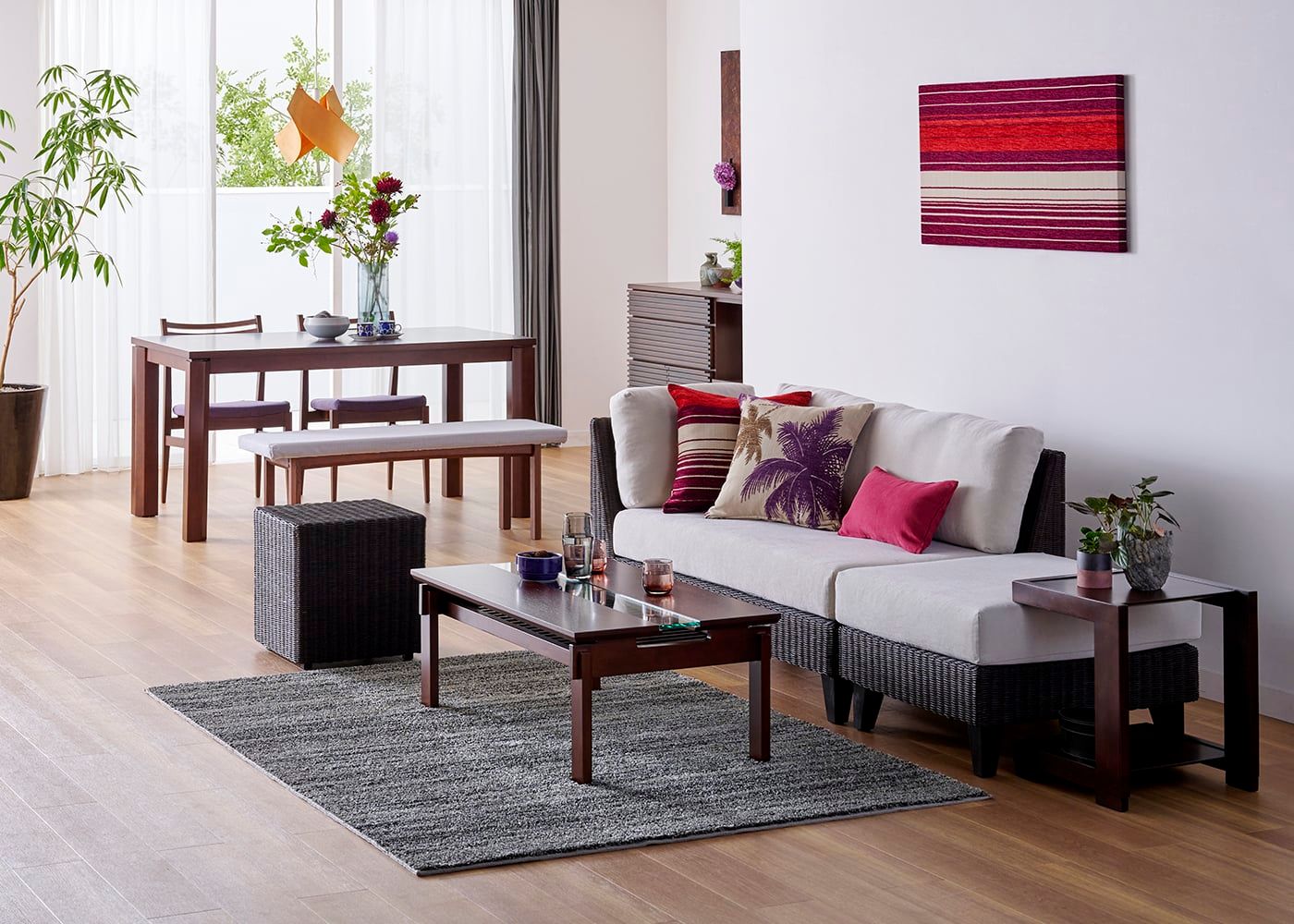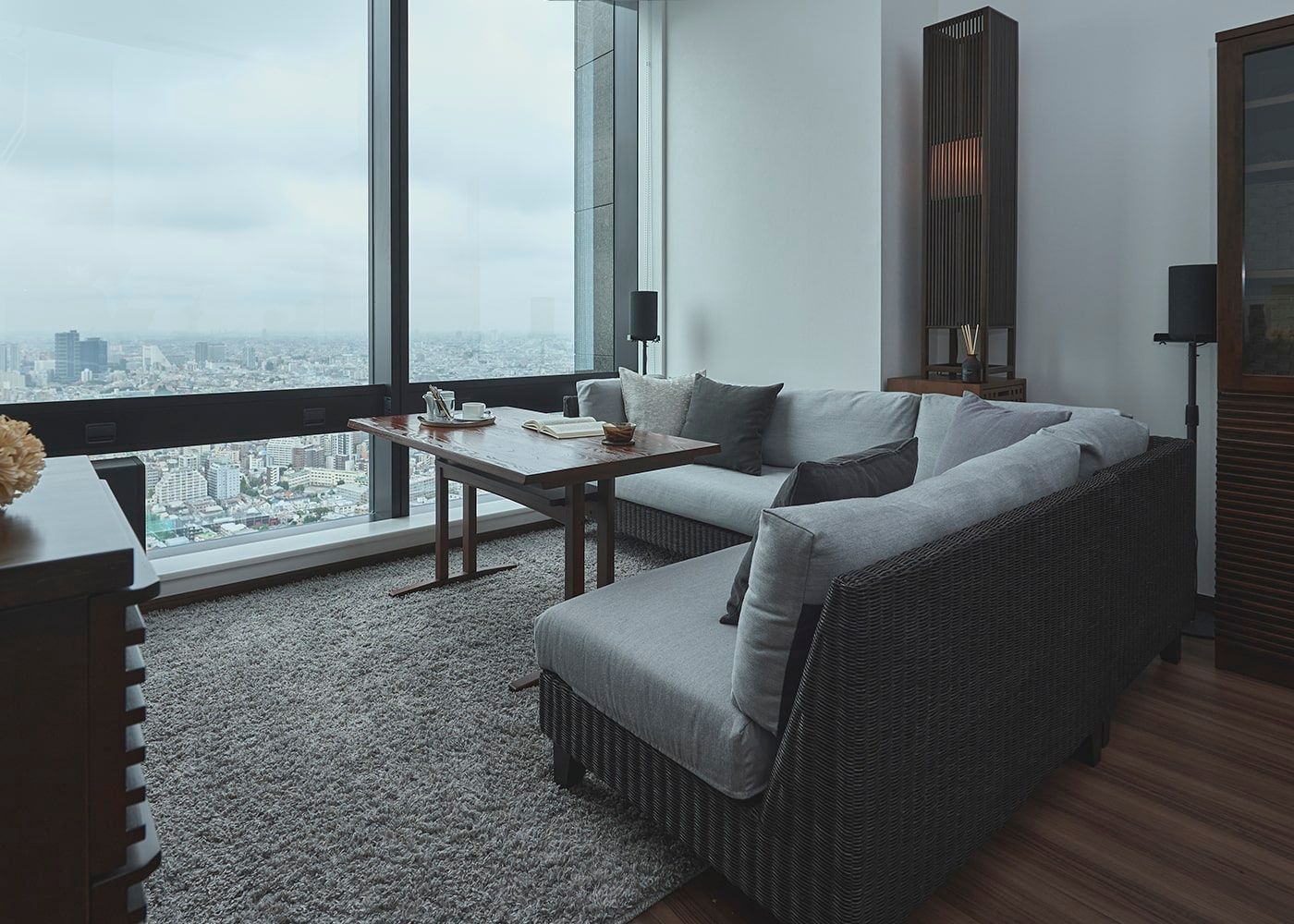 都会の景色を背景に和モダンなソファダイニングセットが映えます。ラタン材とグレーの色合いが洗練された雰囲気を醸し出し、シックで落ち着いた空間を演出。日本の伝統美と現代的なスタイルが融合したデザインは、都市での生活にもぴったりです。