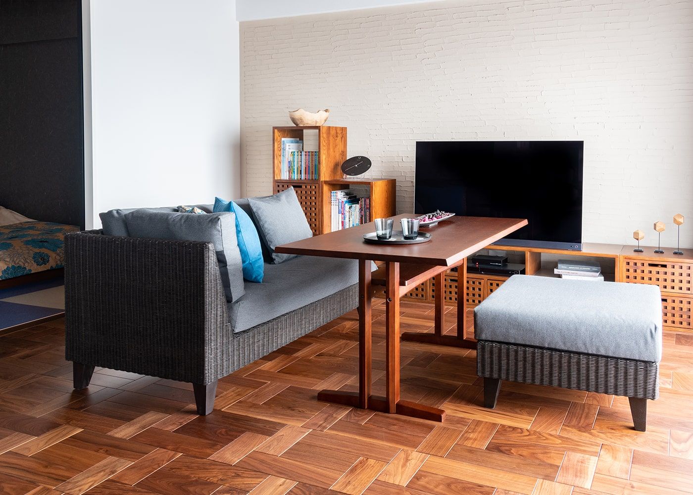すっきり広々とした空間を実現するために、寛ぎスペースと食事の2つのスタイルを1つにまとめたソファダイニングセットを取り入れています。洗練感のあるラタン材のソファは、こだわりのリノベーションで仕上げた内装材と綺麗に調和しました。