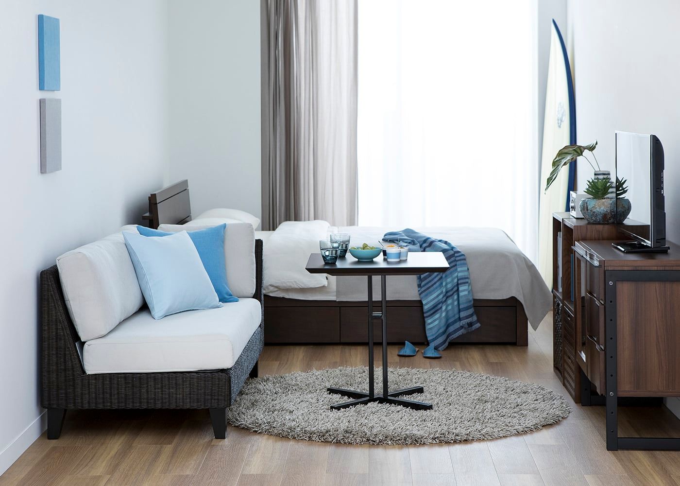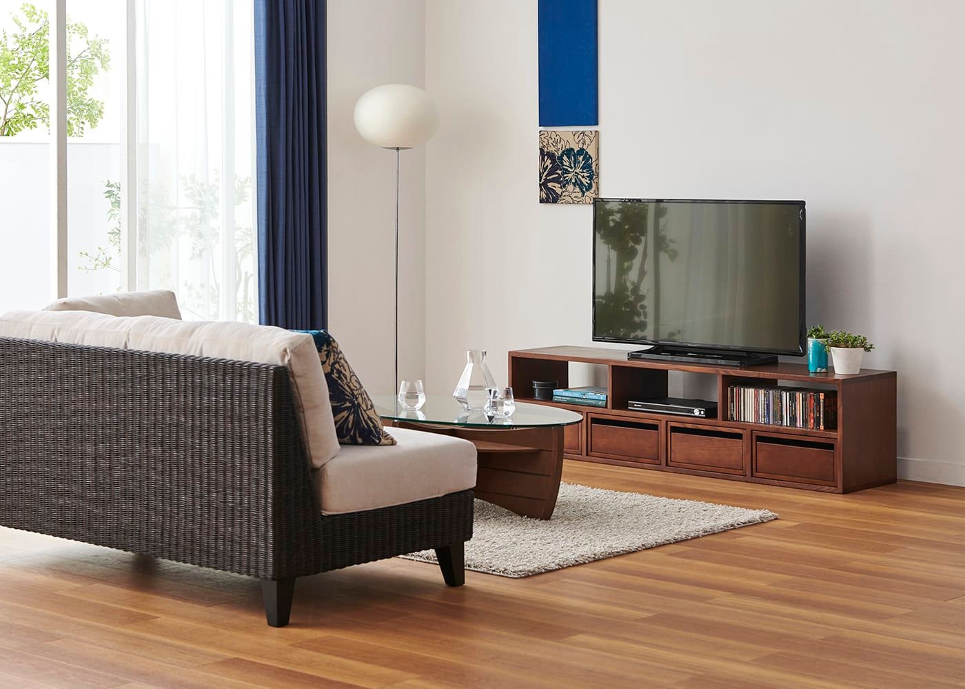 ソファをリビングルームに空間置きしても、片側がアームレスのため抜け感が生まれて、開放感のある部屋を作れます。また、綺麗に編み込まれた天然のラタン素材が映えます。