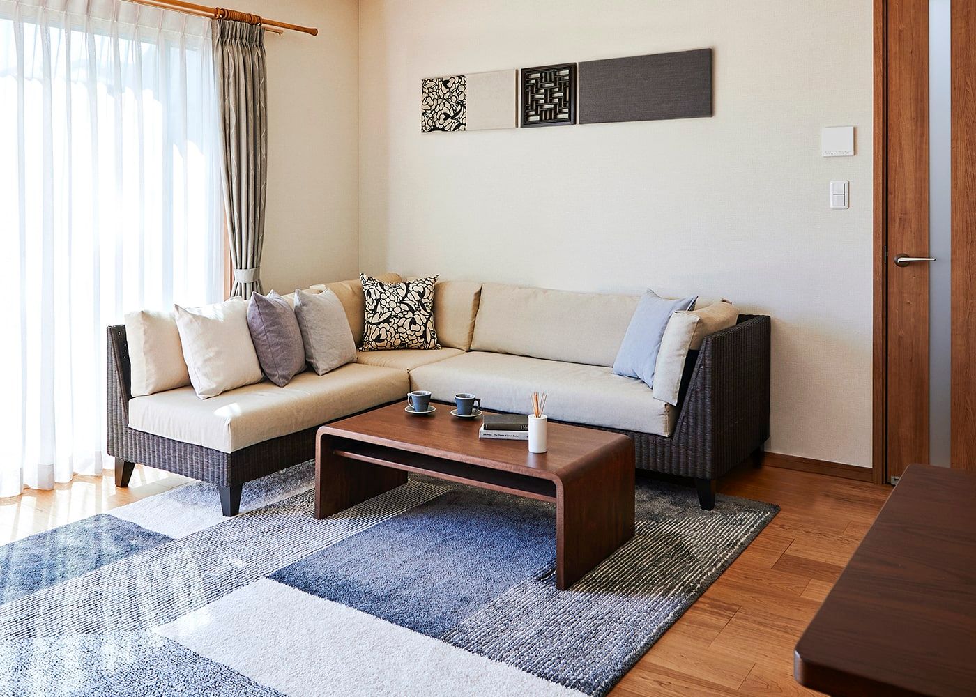 優しいグレーのカラーコーディネートと、それを引き立てる家具が印象的な空間を作り上げています。ラタン素材を使用したコーナーソファと、グレーのファブリックは、ゆったりとリラックスムード溢れる空間に。