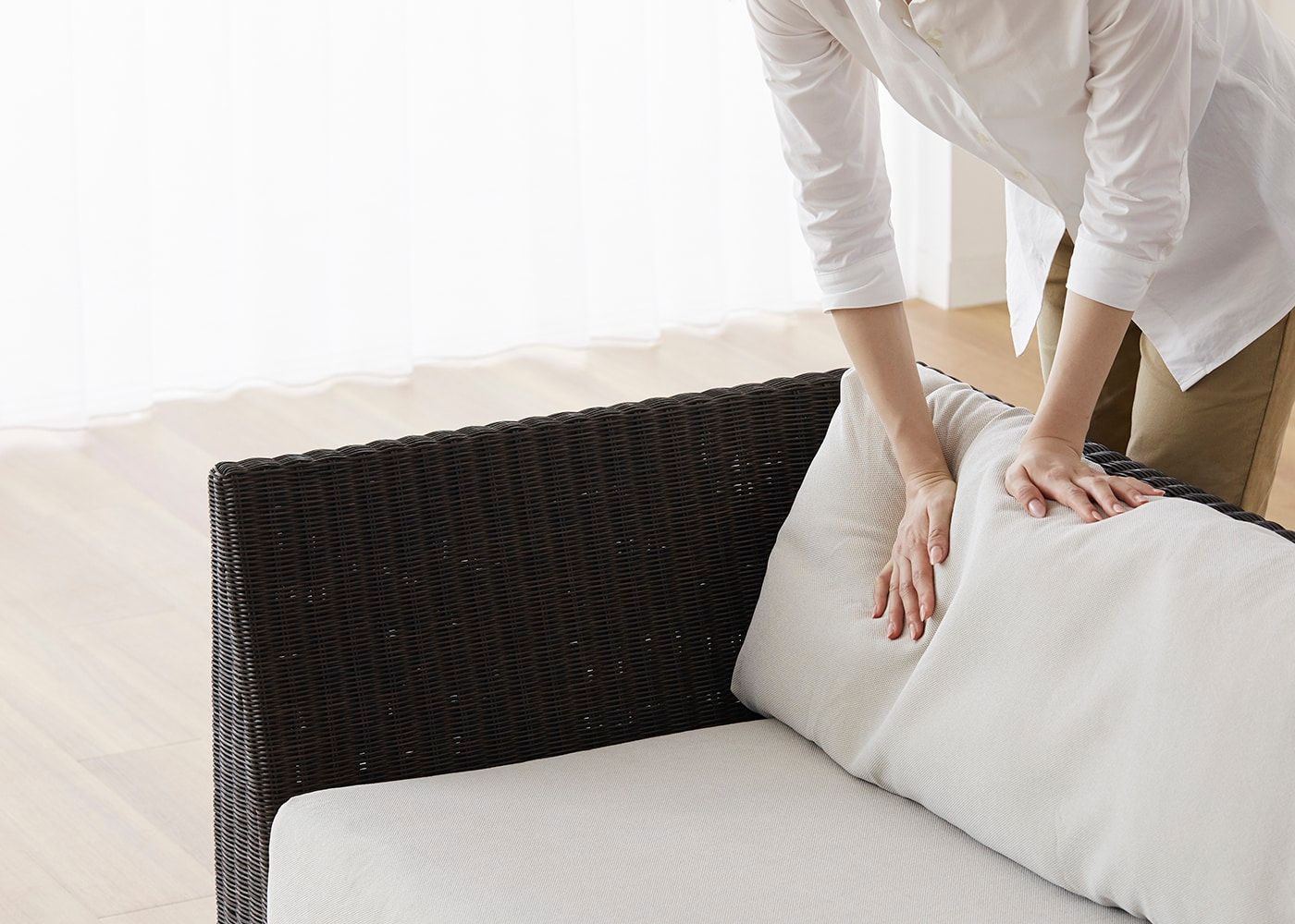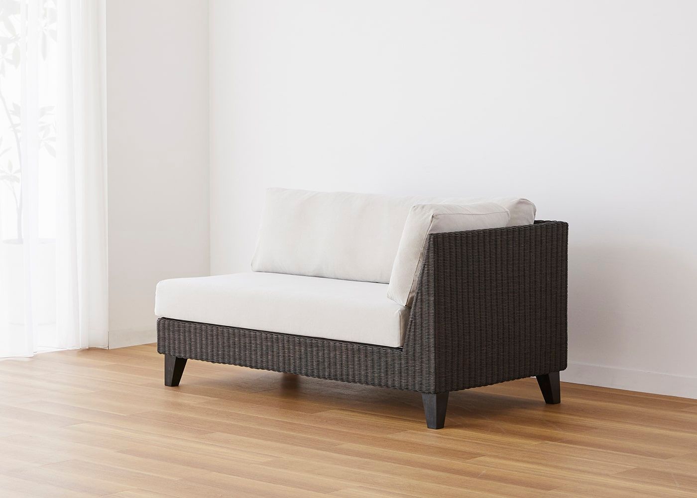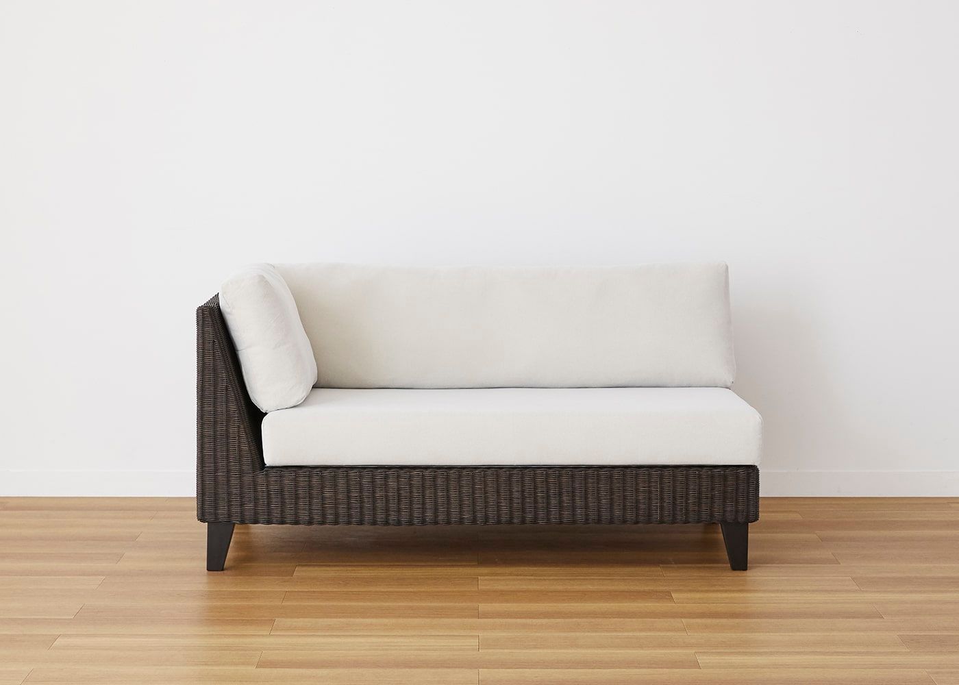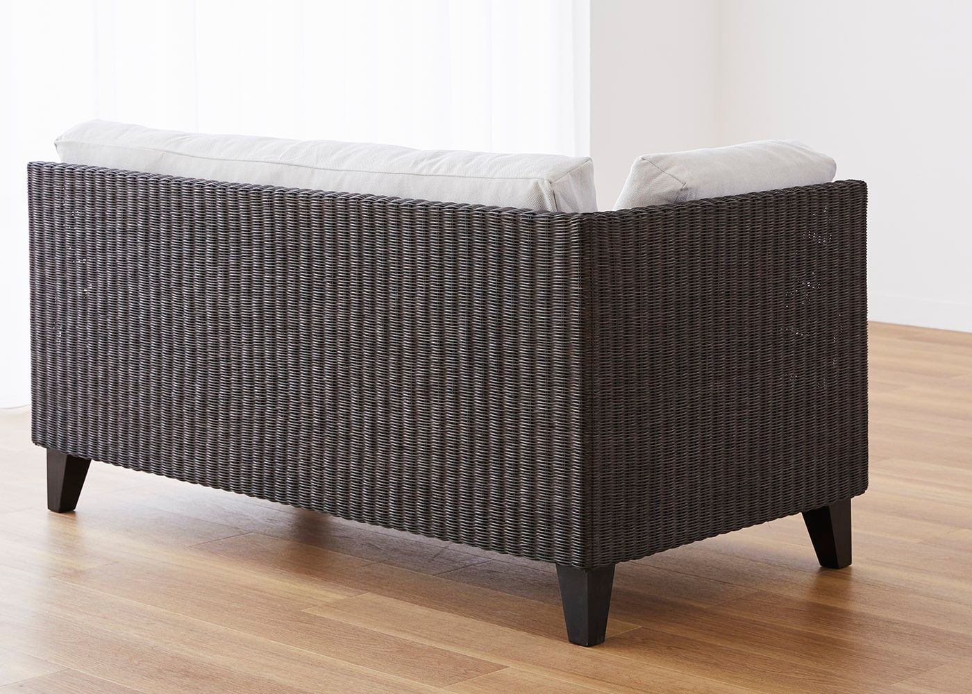 前面はもちろんのこと、背面やアーム側面などソファフレーム全体に編み込まれたラタン。丁寧に編み込まれた素材感や、光の当たり方による陰影などを視覚的に楽しむことができます。