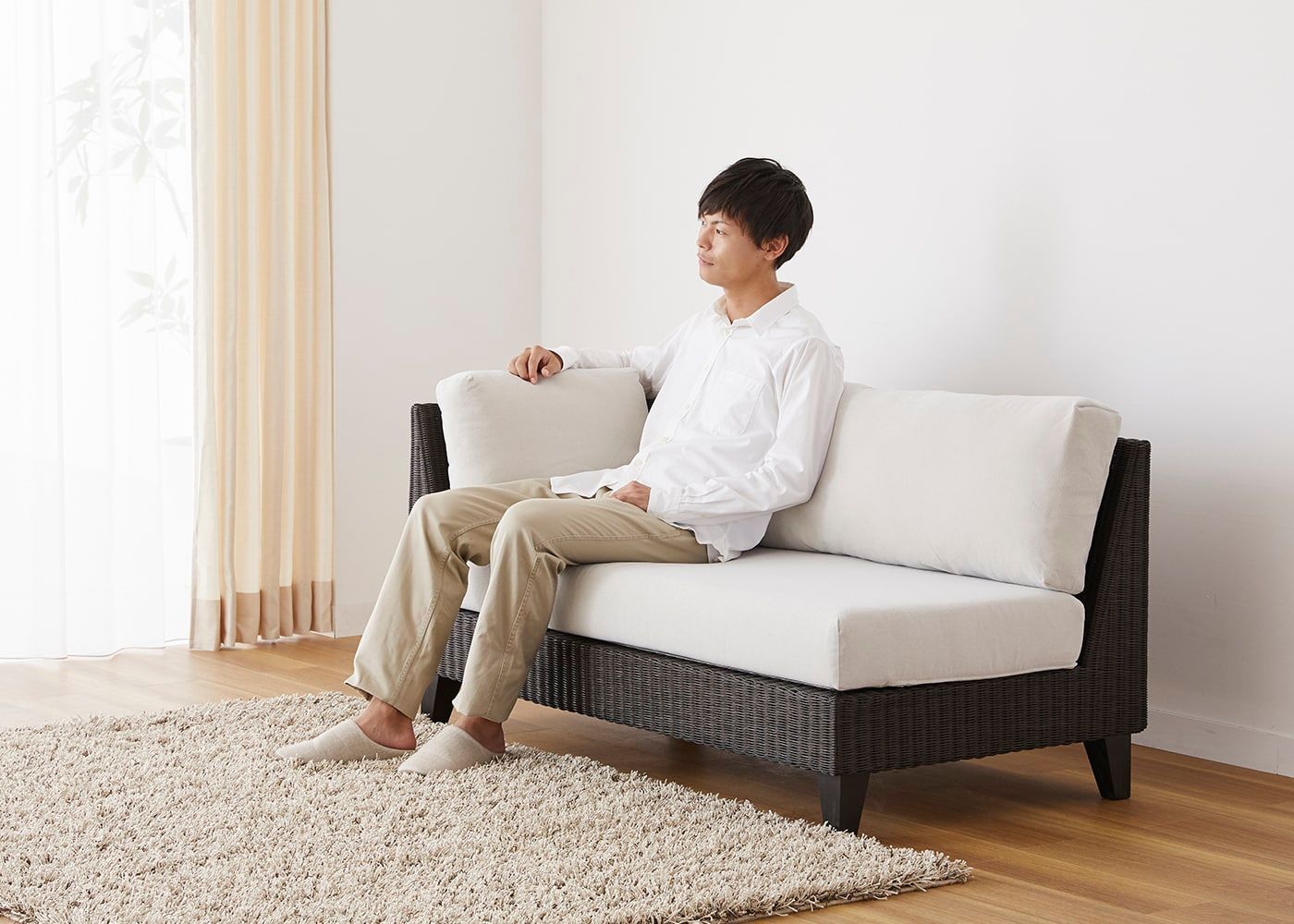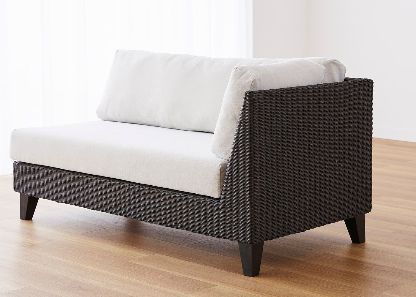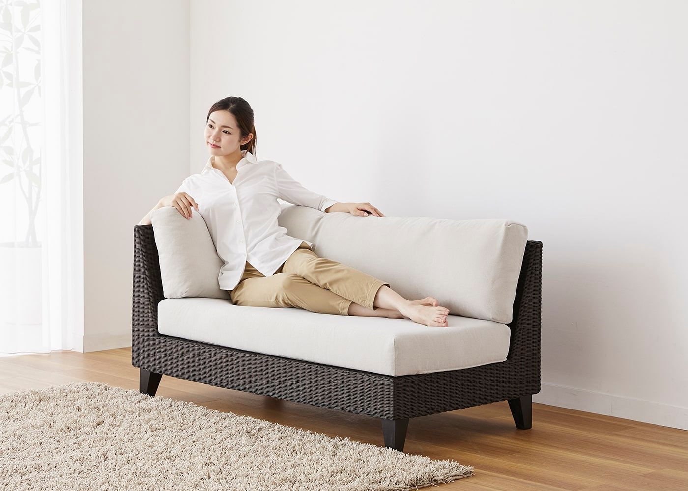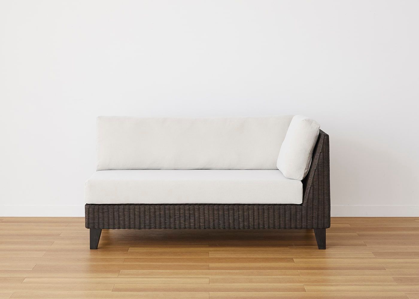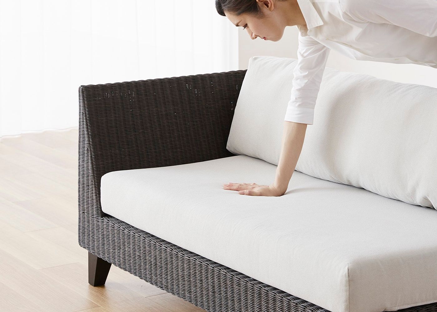 前面はもちろんのこと、背面やアーム側面などソファフレーム全体に編み込まれたラタン。丁寧に編み込まれた素材感や、光の当たり方による陰影などを視覚的に楽しむことができます。