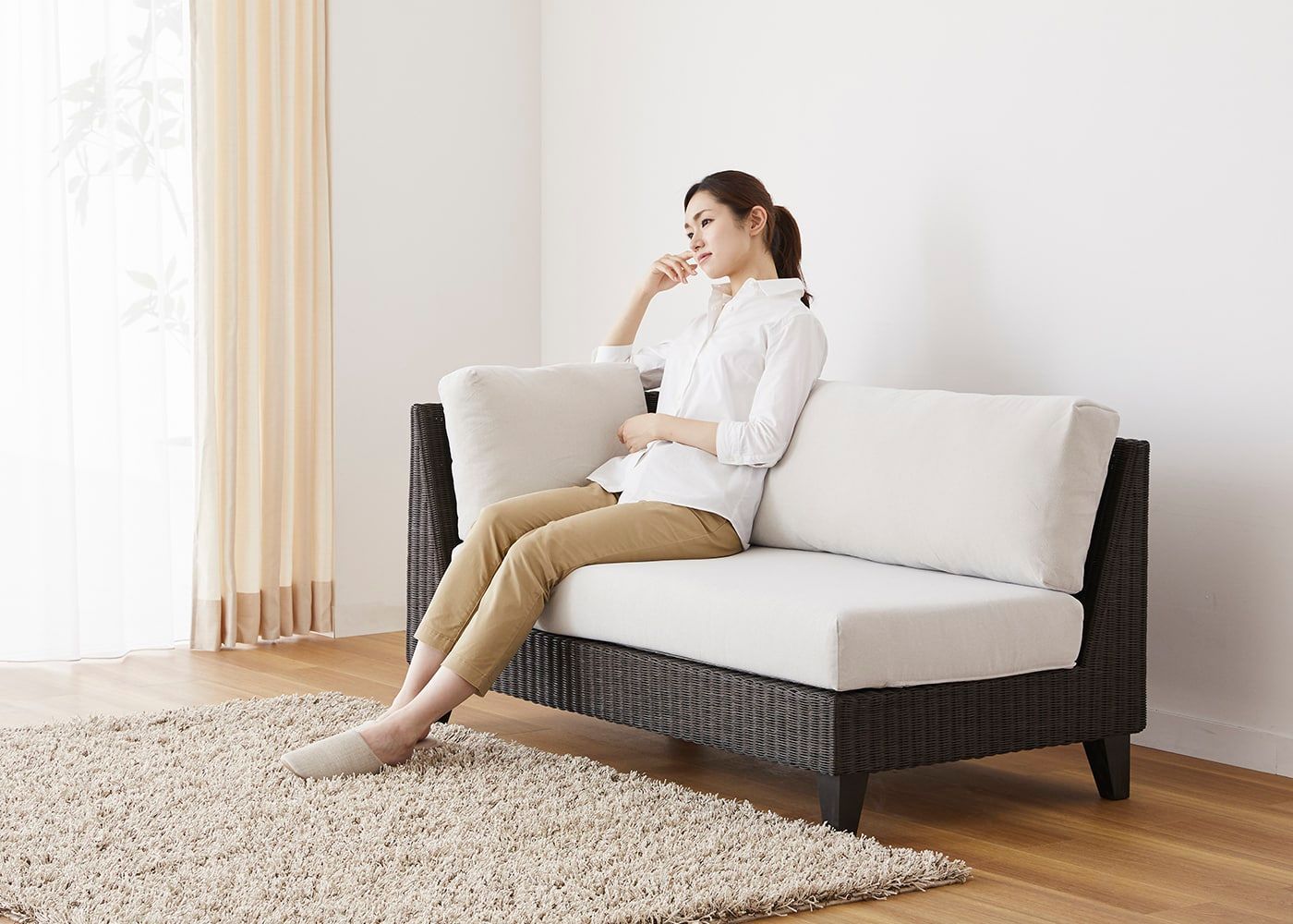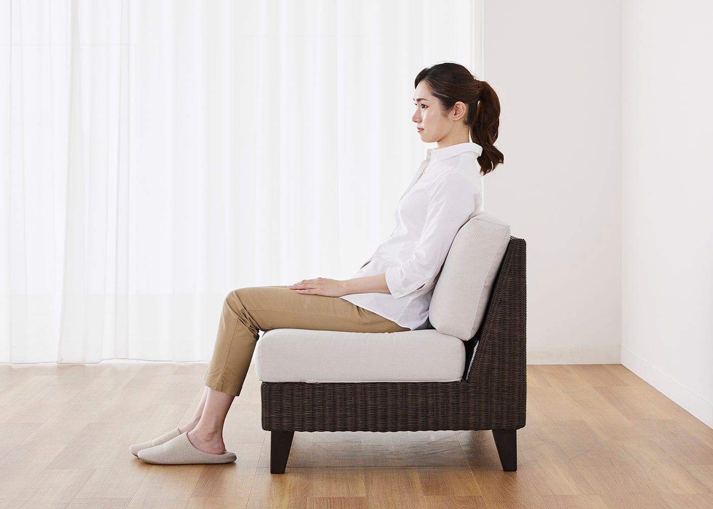 奥行き750mmのソファは、正しい姿勢で快適に身体を預けることができ、長時間座っていても疲れにくいです。座面の深さが絶妙で、リラックスしたひとときをサポートします。(モデルは身長167cmの女性)