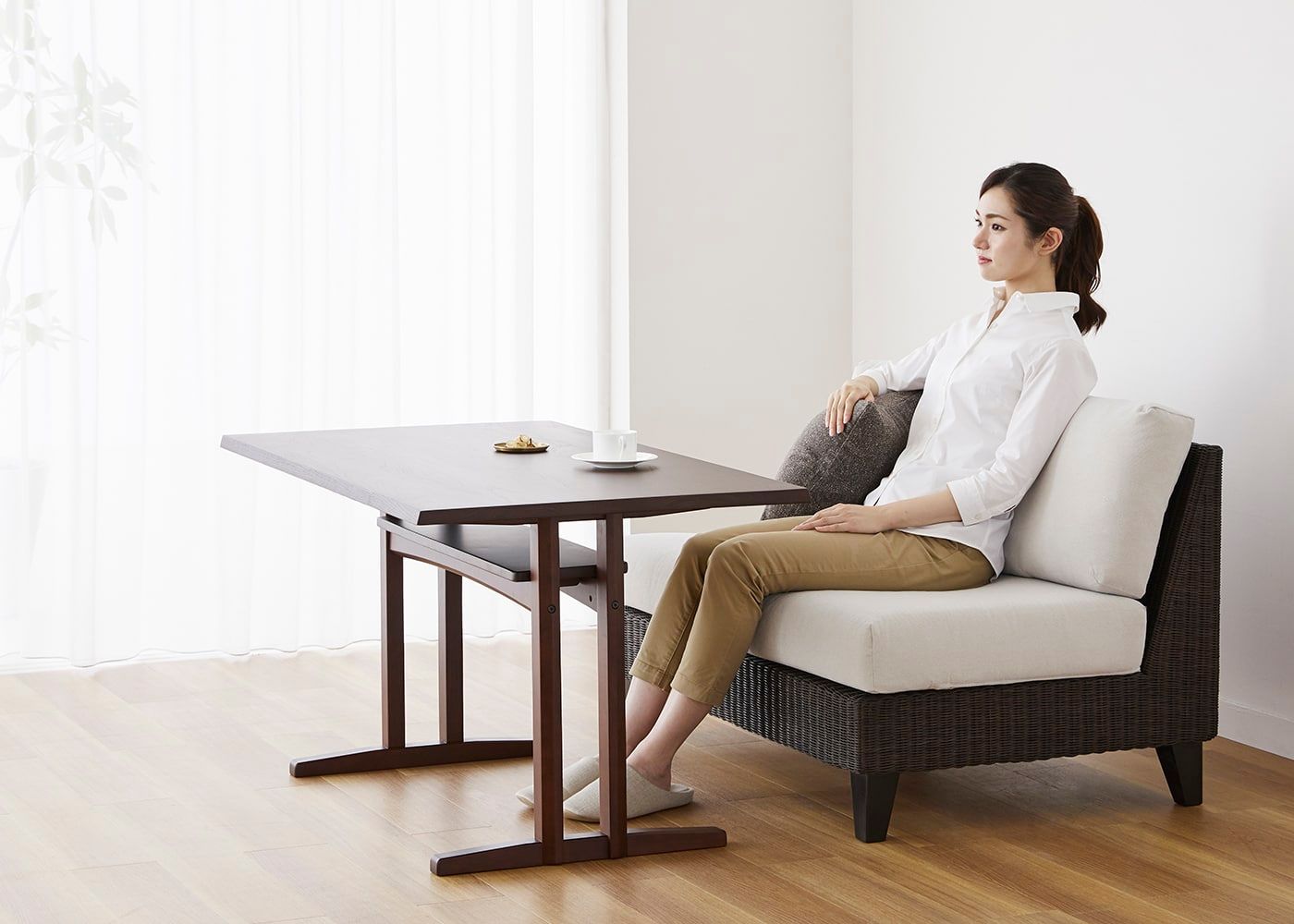 リラックスと食事の両方に最適な高さで、家族や友人とのコミュニケーションを豊かにします。多機能性を兼ね備えたこのスタイルは、生活空間を便利で心地よく演出します。(モデルは身長167cmの女性)