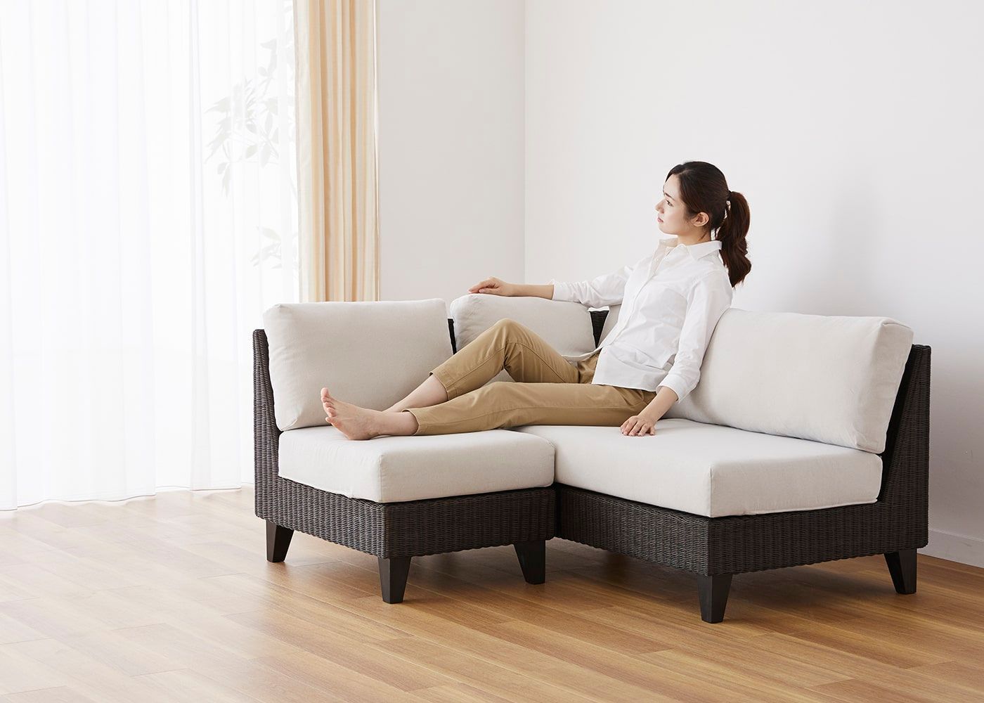 コーナーセットに。右アームソファの角に座って、ベンチの座面スペースに脚を伸ばしてくつろげるのが魅力です。(モデルは身長167cmの女性)